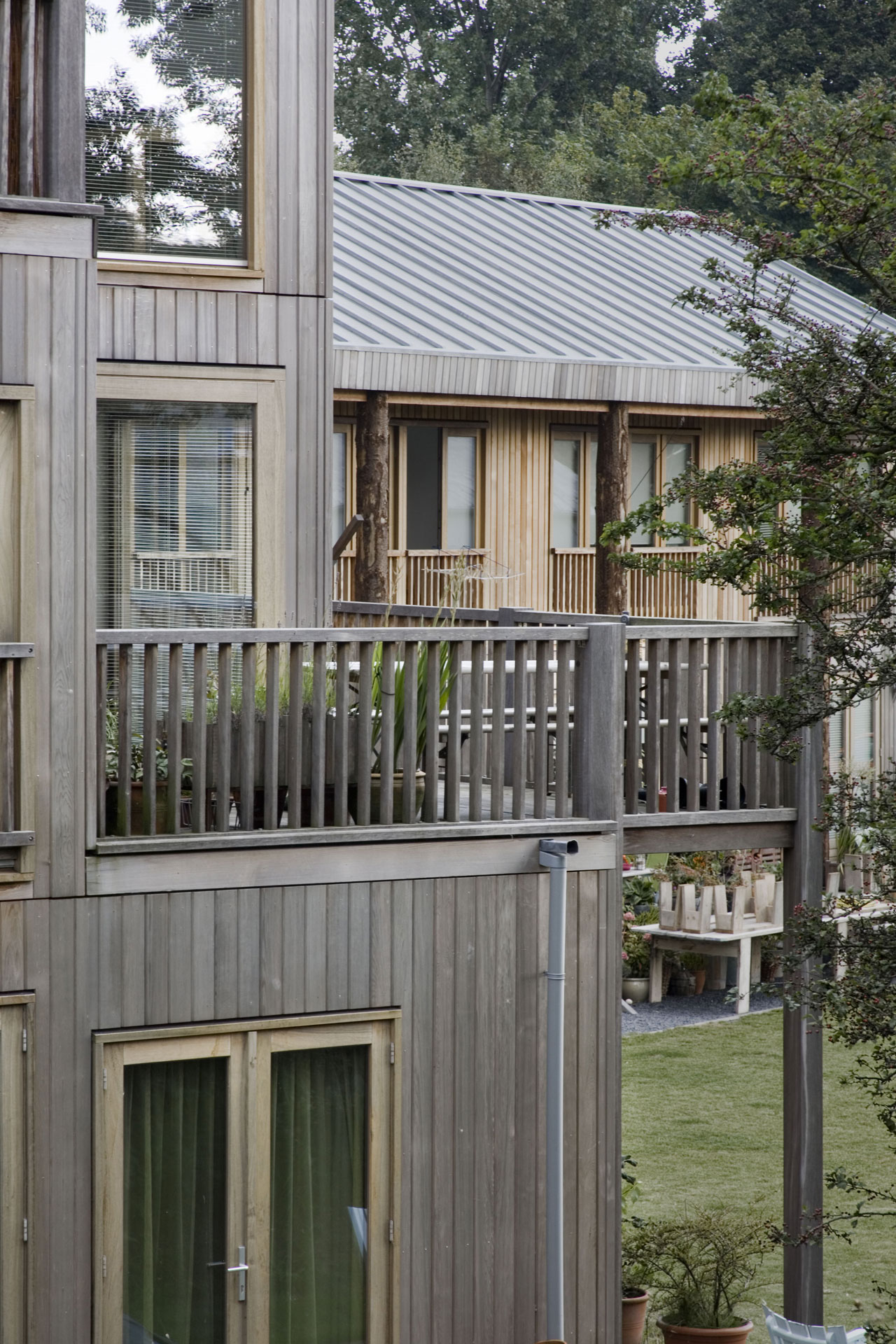 De gevels, de balkons en de kozijnen zijn van onbehandeld hout. Door veroudering ontstaat een karaktervol grijs patina dat zich in kleur verhoudt tot het verweerde beton van het fort.