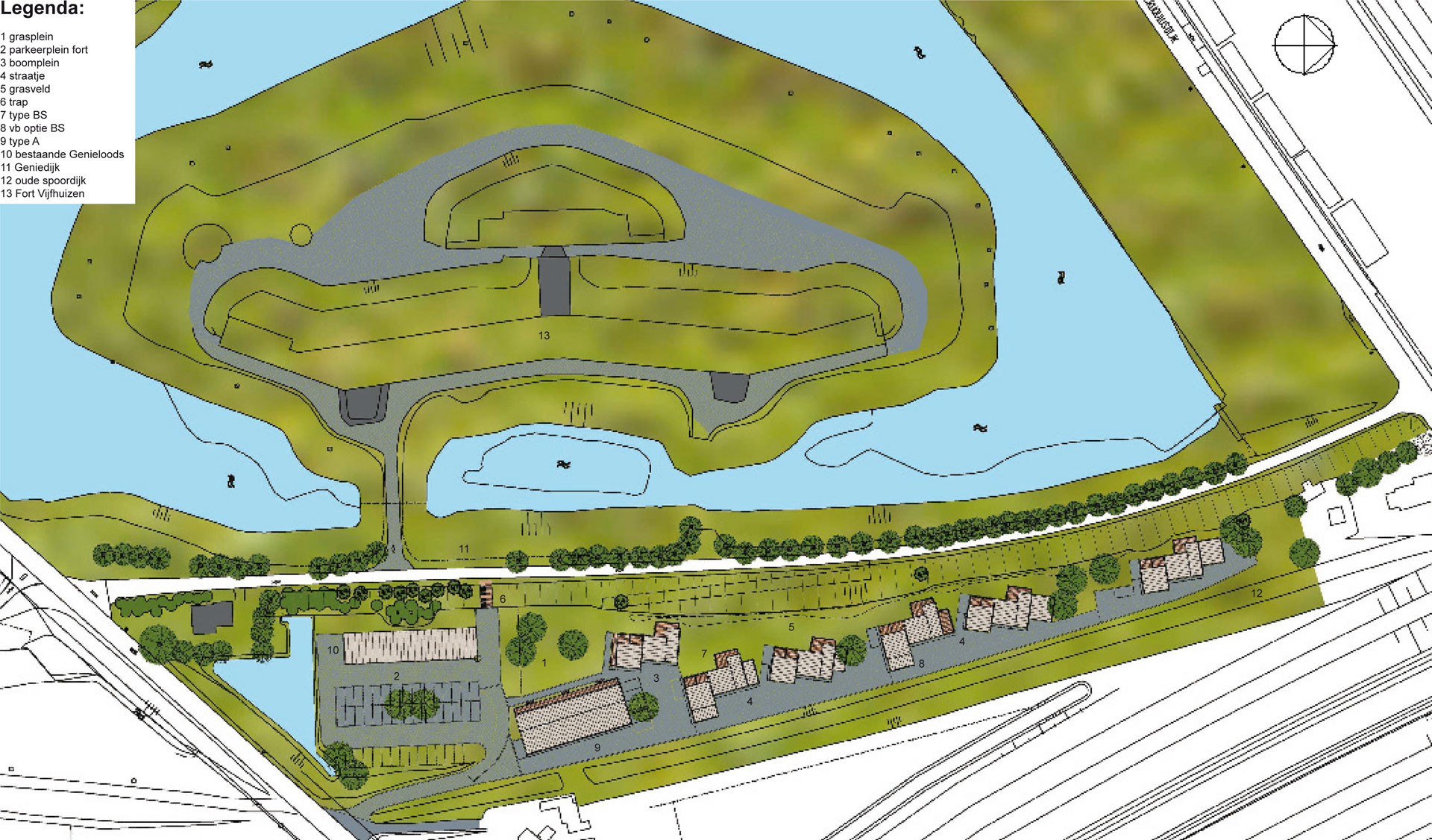 De houten huizen vormen een geheel met het (kunst)fort Vijfhuizen. Het fort maakt deel uit van de Stelling van Amsterdam. De ogenschijnlijk losse opzet van de huizen creëert stedebouwkundige ruimtes en plekken met een verschillend karakter. De veelheid aan perspectieven en het wisselende beeld wordt verrijkt door de uitwerking van de individuele bewonerswensen in de opbouw en de gevel. Er is variatie ontstaan binnen het geheel.Er zijn drie type woningen. Type B en type S vormen een onherkenbare 2-onder-1-kap, de types A vormen samen een lang blok. De woningen B en S hebben een woonkamer op de 1e verdieping zodat ze over de Geniedijk naar het fort kijken. Op de begane grond bevinden zich de slaapkamers en op de 2e verdieping onder de kap het atelier. In de loop van de tijd hebben bewoners kleine aanbouwen gedaan, die door eenzelfde materiaalgebruik moeiteloos opgaan in het geheel.