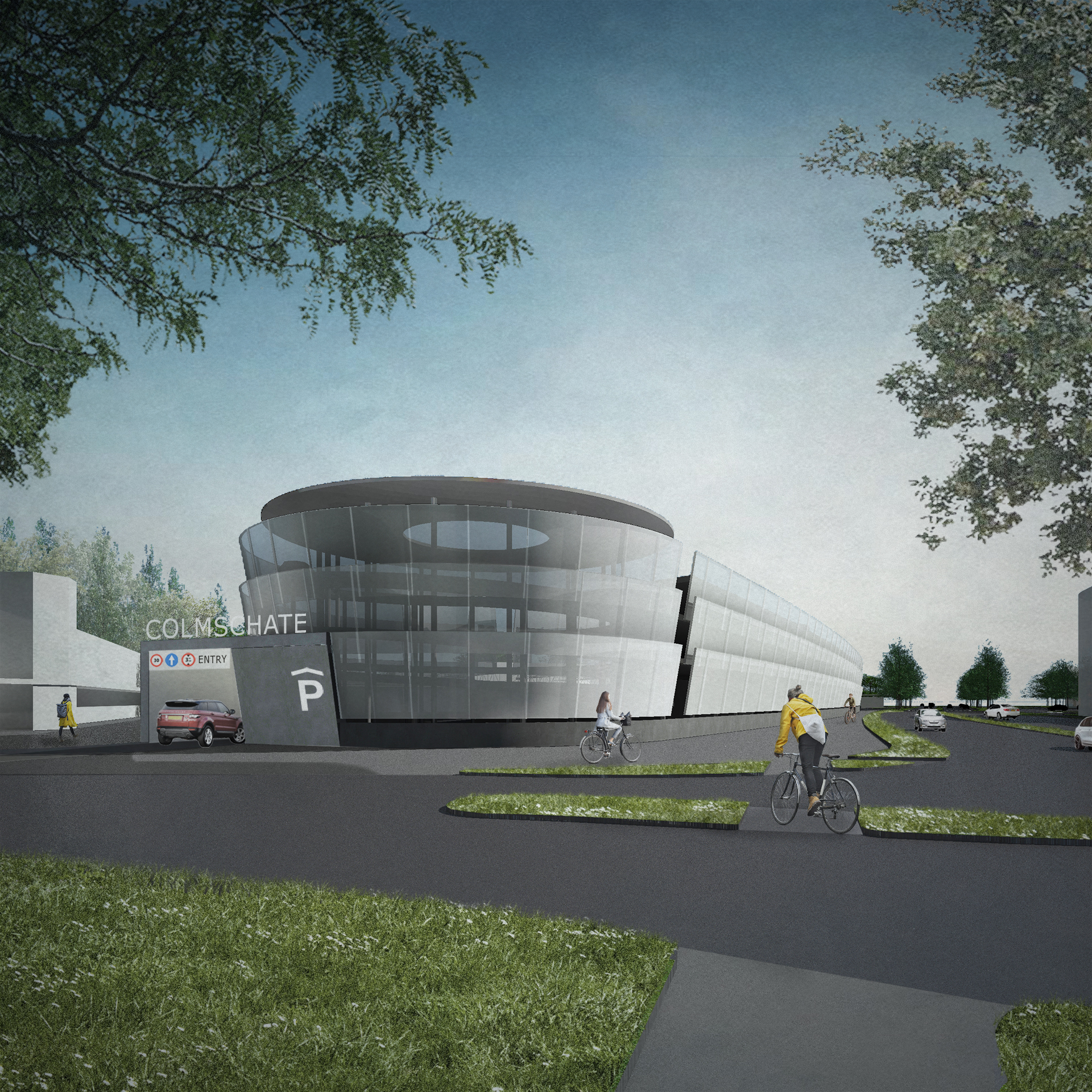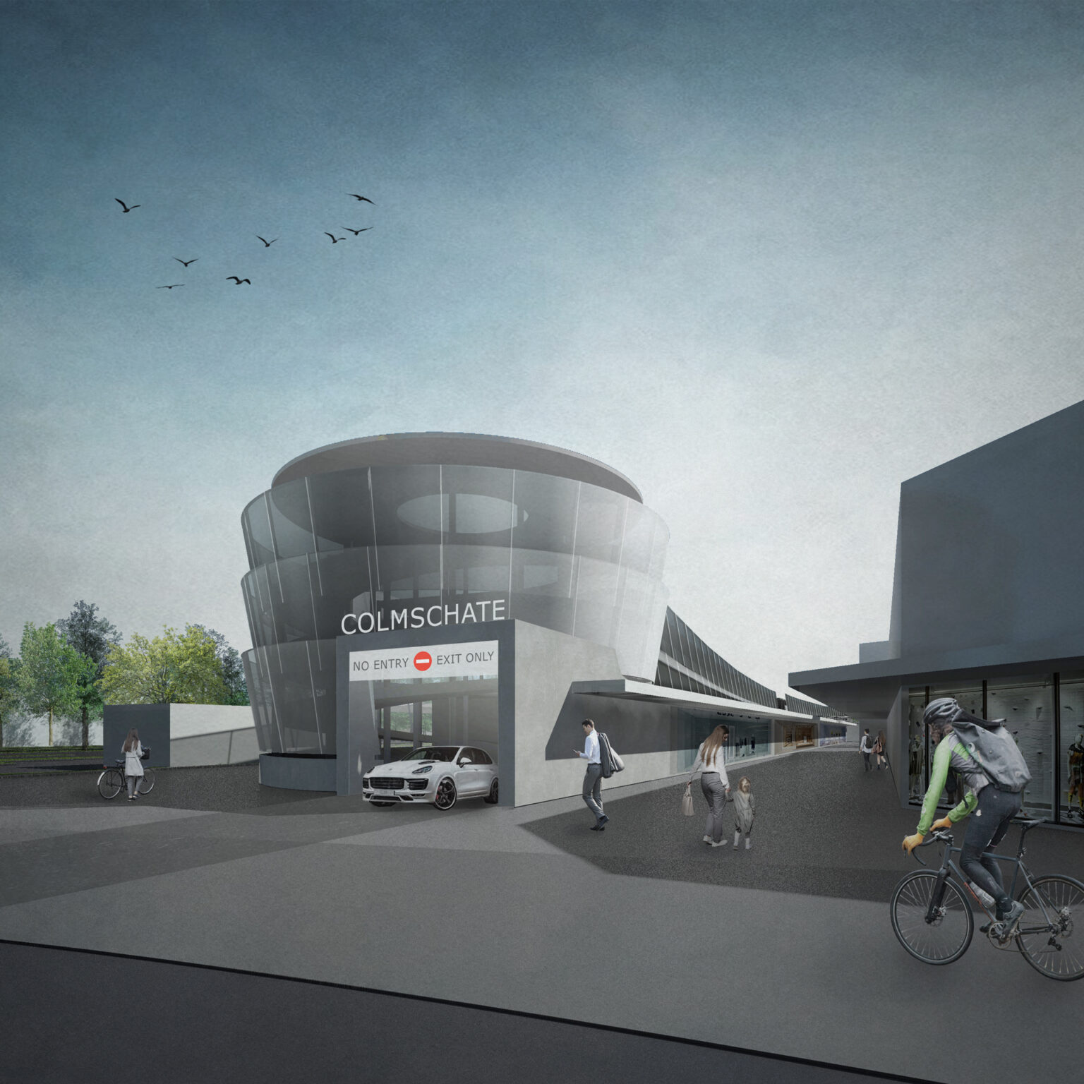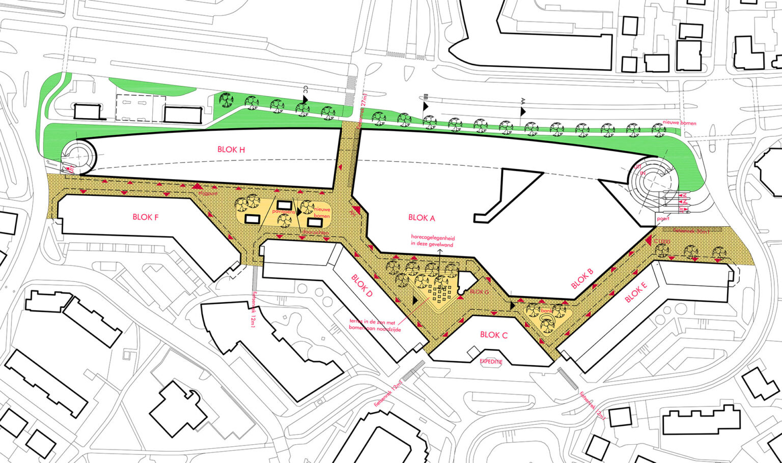 De uitbreiding van de vierkante meters winkelruimte geeft de mogelijkheid om het open winkelgebied om te vormen tot een besloten en prettige winkelstraat. De gebogen parkeergarage geeft het winkelcentrum een duidelijk gezicht aan de doorgaande weg en schermt het af. Aan de zonzijde wordt de parkeergarage bekleed met zonnepanelen.