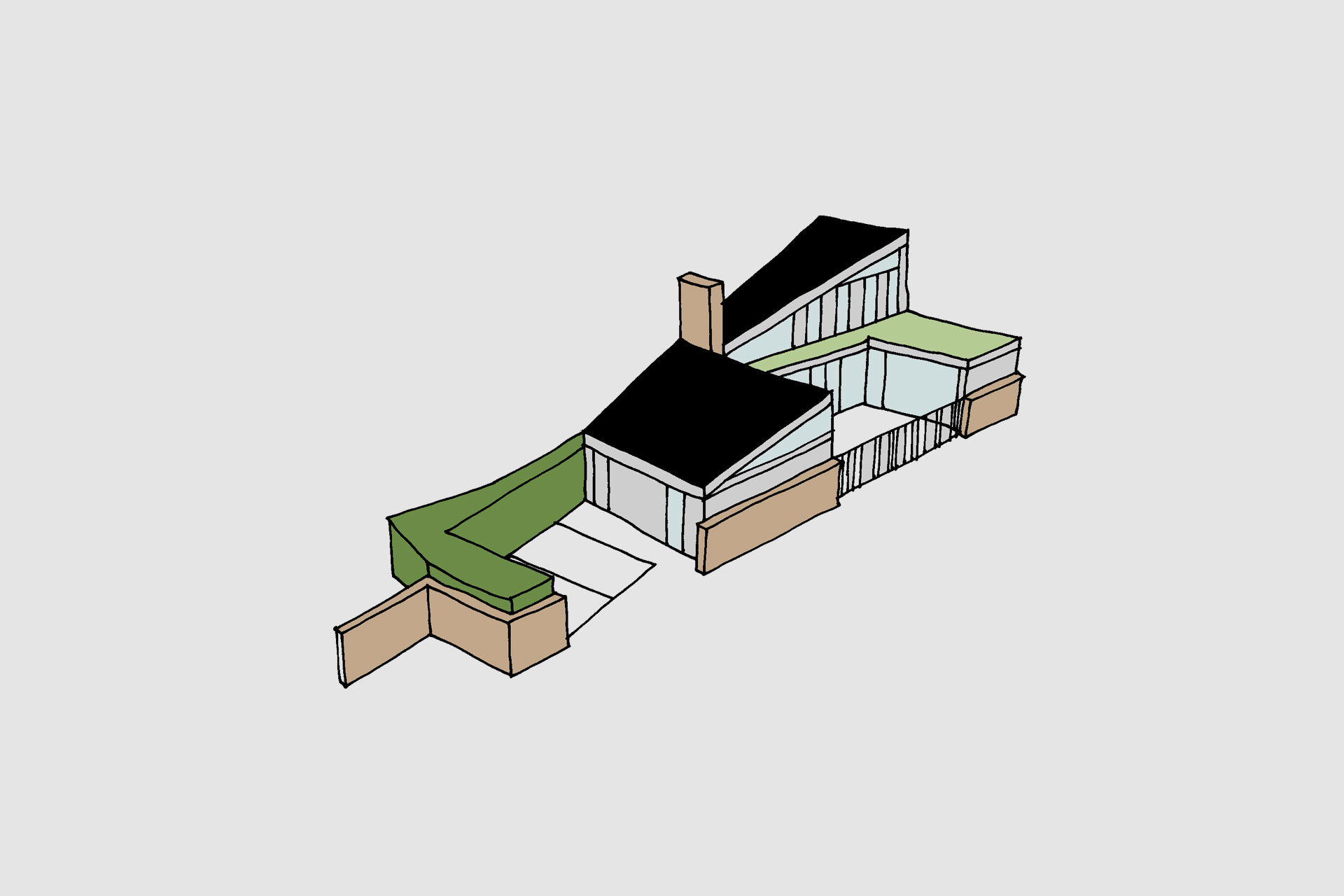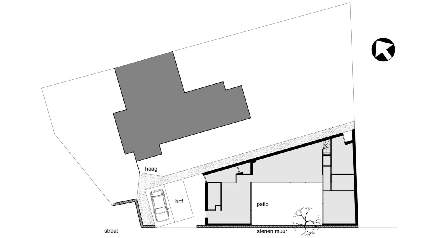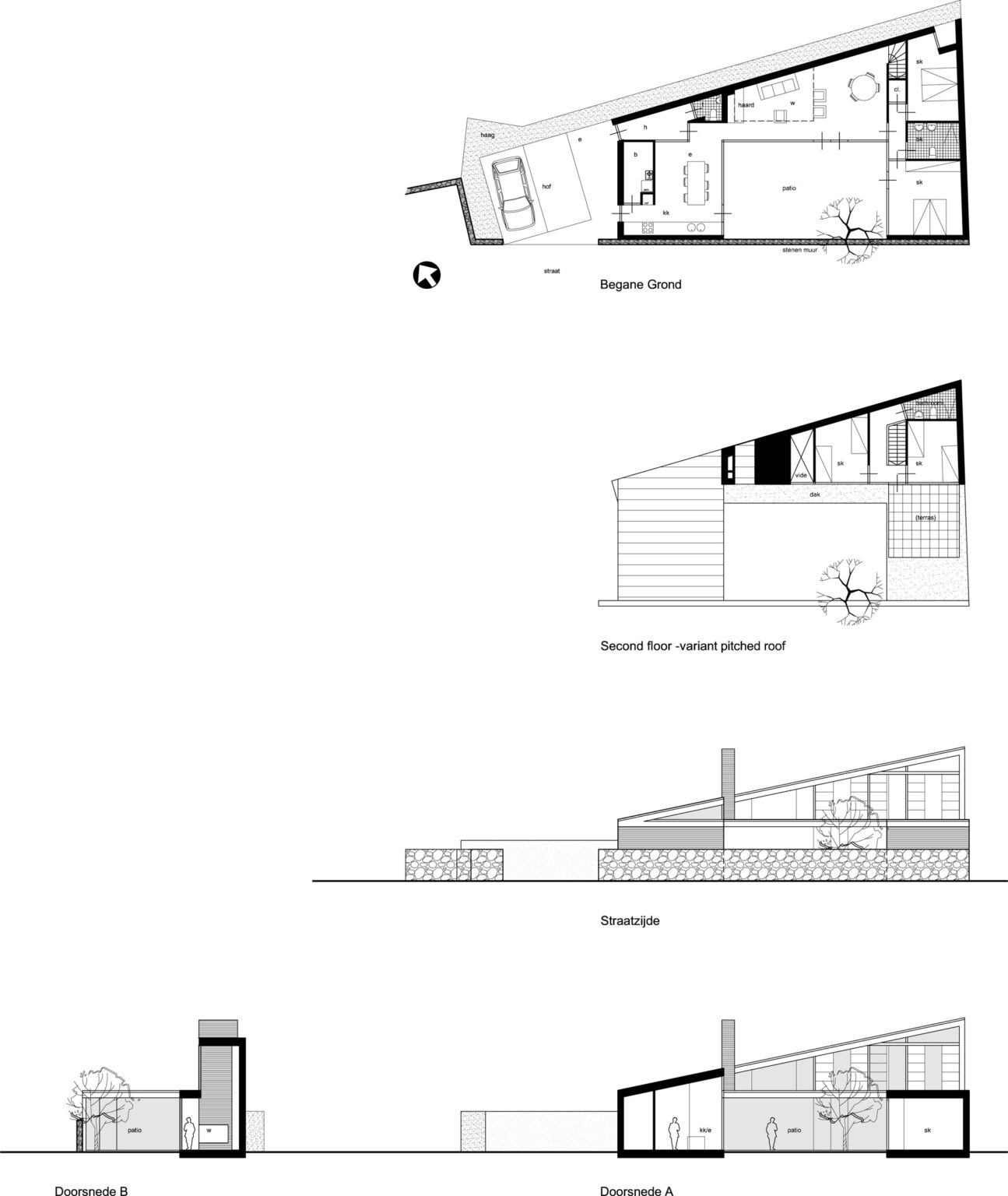 Het huis is ontworpen voor een ouder stel met bezoekende kinderen. De langgerekte kavel langs de straat is afgesplitst van de tuin van het oude huis. Het nieuwe huis ligt met de rug naar de oude tuin. Langs de straat ligt een patio. De ruimtes van het huis zijn functioneel en visueel om de patio geschakeld. Bewegingen door het huis gaan altijd langs de patio. Grote glasvlakken naar de patio verkleinen het verschil tussen binnen en buiten. Aan de rugkant van het huis bevindt zich de open haard aan een dubbelhoge ruimte.