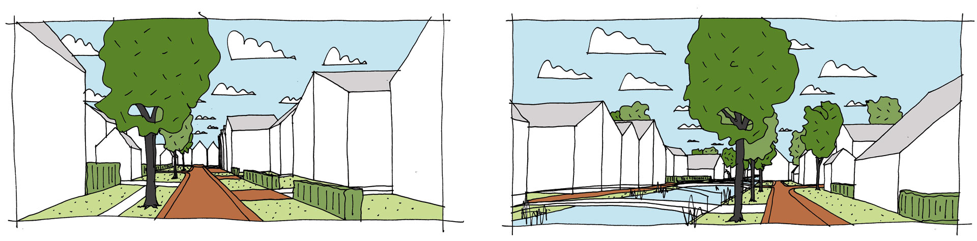 Met behulp van kleine straten, een menging van woningtypen door het gehele plan en de ruimtelijke schakeling van huizen en tuinen wordt een losheid verkregen die kenmerkend is voor dorpen.