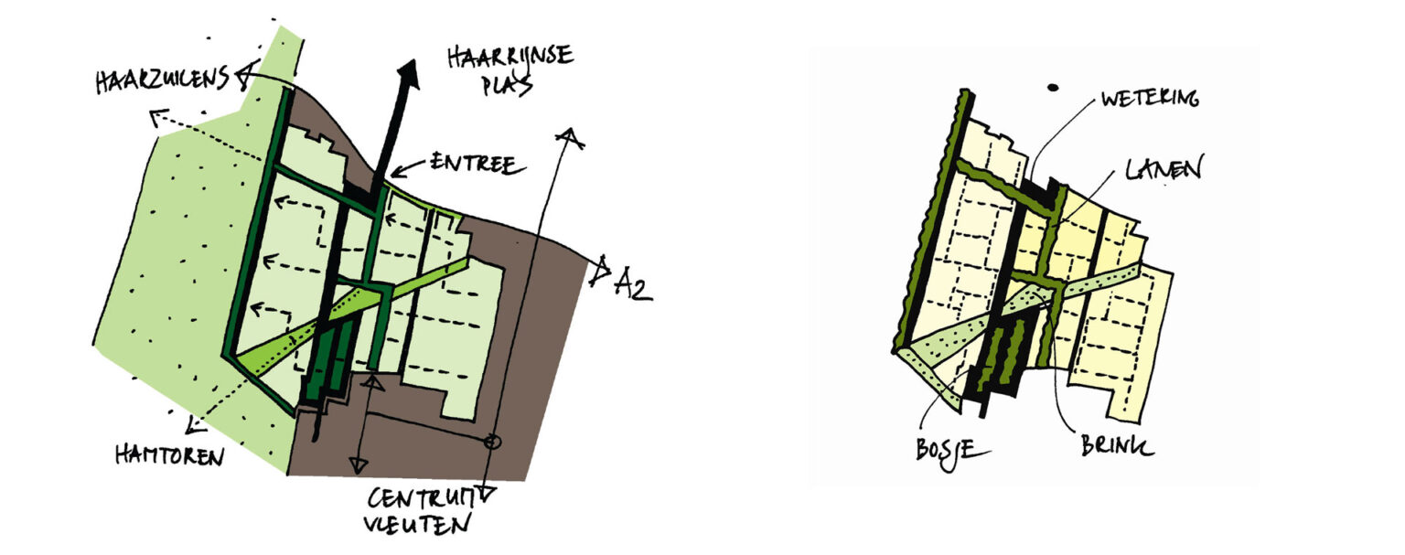 De nieuwe wijk Haarzicht maakt deel uit van de Vinex-wijk Leidsche Rijn. De opgave vroeg om een wijk met dorpse eigenschappen. Het plan is gesitueerd tussen Vleuten, kasteel Haarzuilens en de snelweg. De structuur van het plan wordt bepaald door een aantal karakteristieke elementen: een bestaand bosje, een nieuwe wetering, de brink en de lanen. Deze verbinden de wijk met de wijde omgeving.