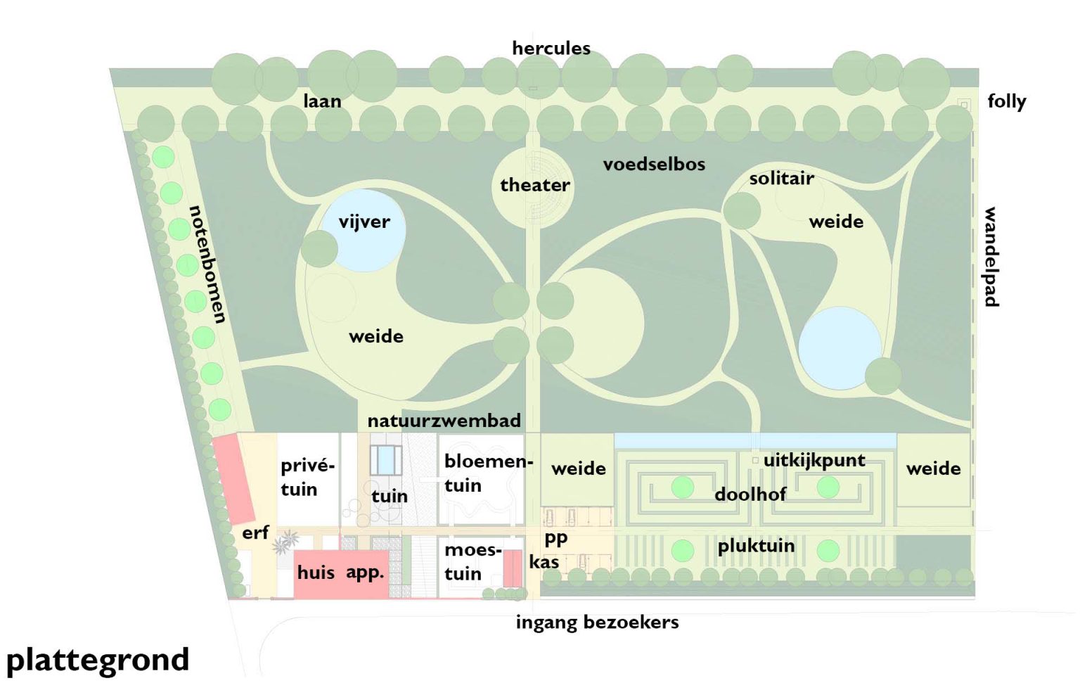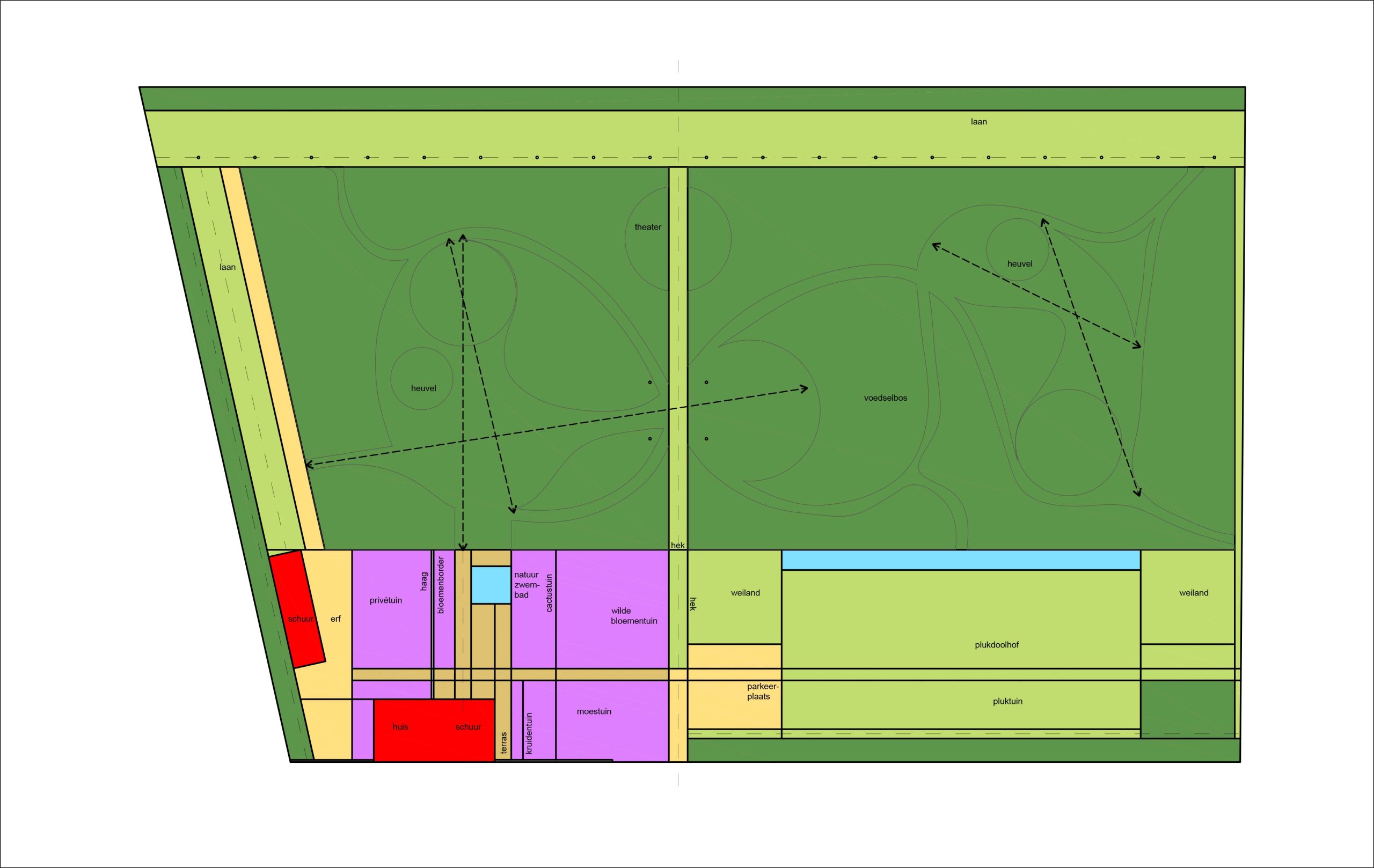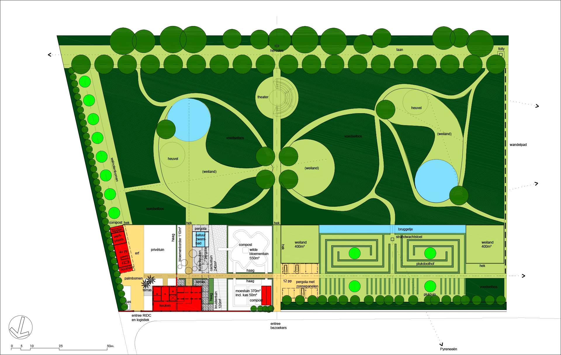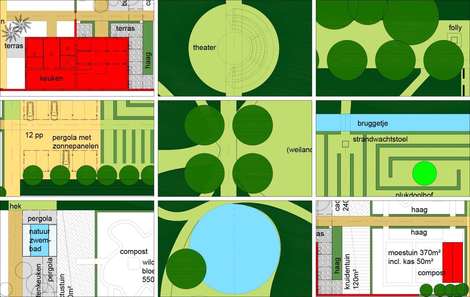 We hebben voor de Mas niet alleen het huis met de appartementen ontworpen, maar ook de bijgebouwen, de tuin en het voedselbos. Op het terrein komt een moestuin met kas, een kruidentuin, een cactustuin, een natuurzwembad, een buitenkeuken, een parkeerplaats met afdak en zonnepanelen voor de gasten, een boomgaard, een doolhof, een paar weiden voor geiten, ezels en kippen én een voedselbos waar je niet alleen kan plukken, maar ook kan wandelen. Het is zo ontworpen dat er tijdens je wandeling steeds nieuwe perspectieven ontstaan en je verschillende routes kan nemen zodat je niet snel uitgekeken bent.