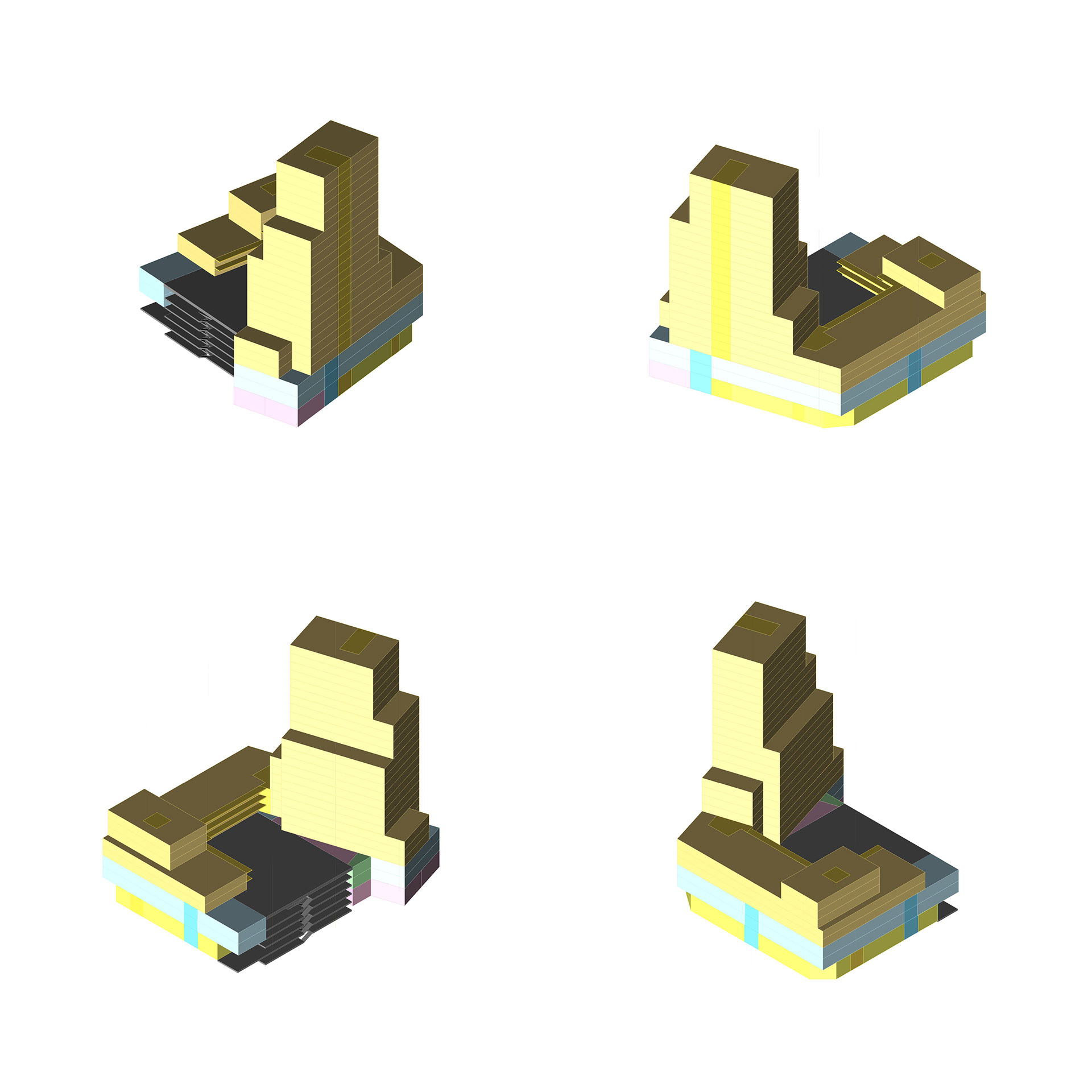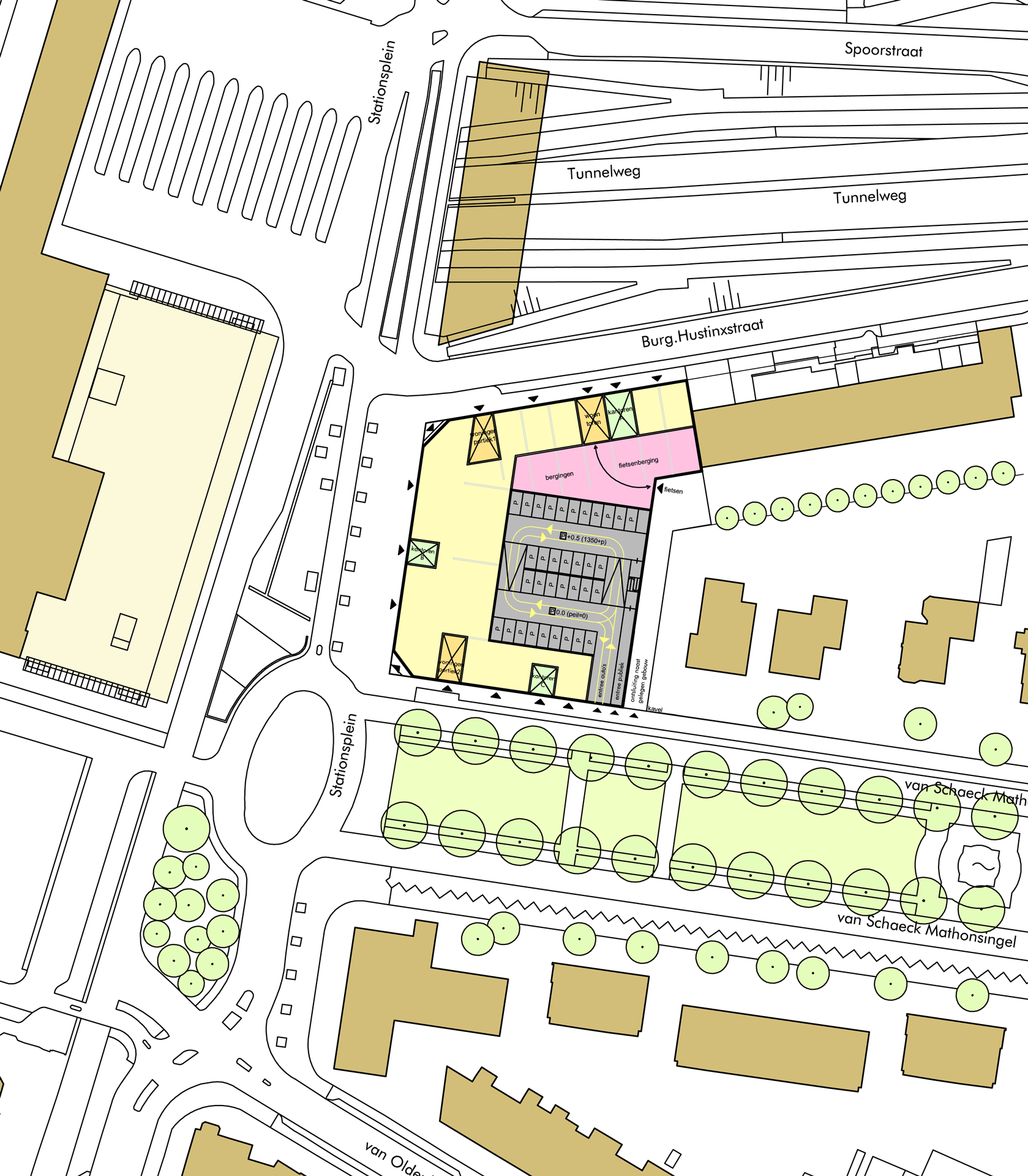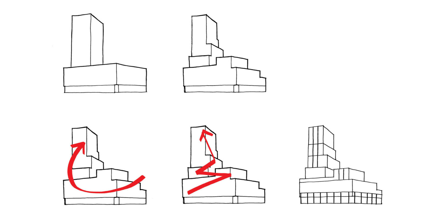 Het bouwblok vormt een stedelijke wand naar het stationsplein. Op de begane grond bevinden zich winkels en daarboven twee lagen kantoren. Met dit programma in de plint draagt het gebouw bij aan het stedelijk karakter van de openbare ruimte. Boven de plint liggen een aantal woonlagen rondom een binnentuin. Uit deze massa groeit trapsgewijs een toren, die op het schaalniveau van de stad een landmark vormt.