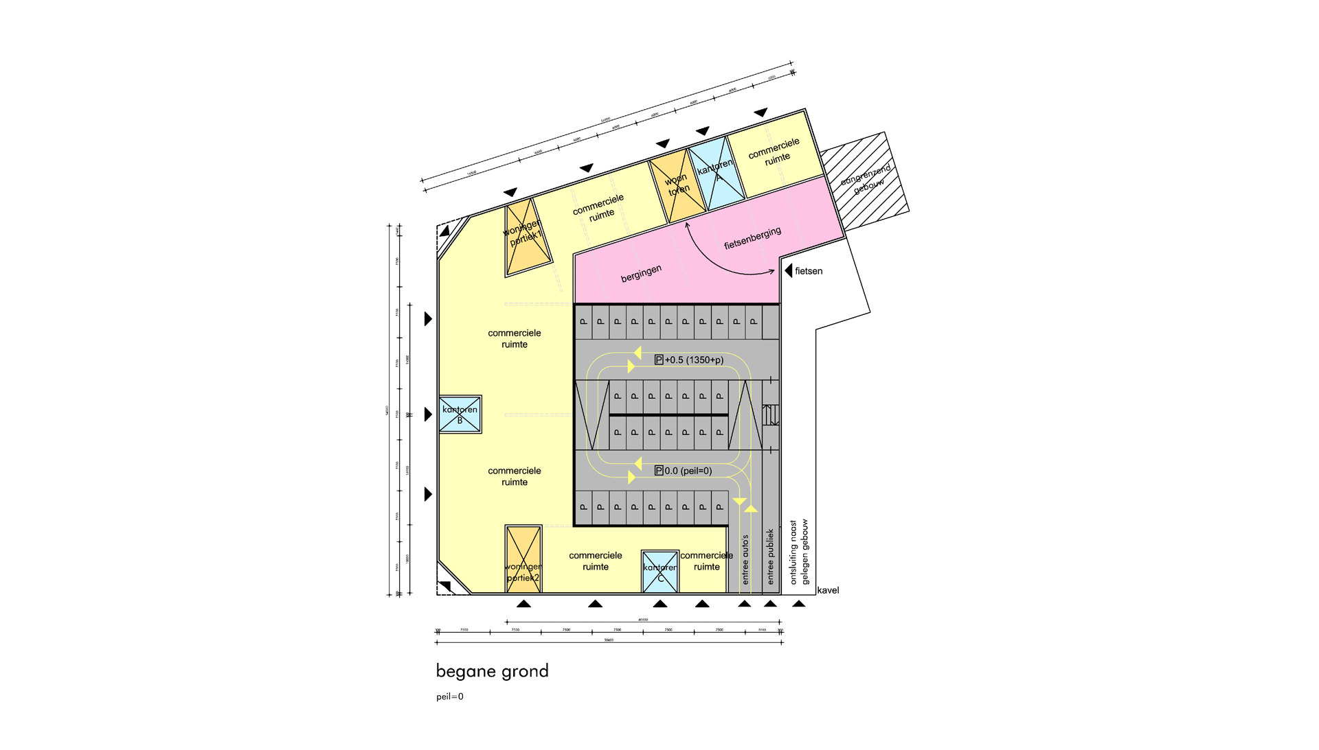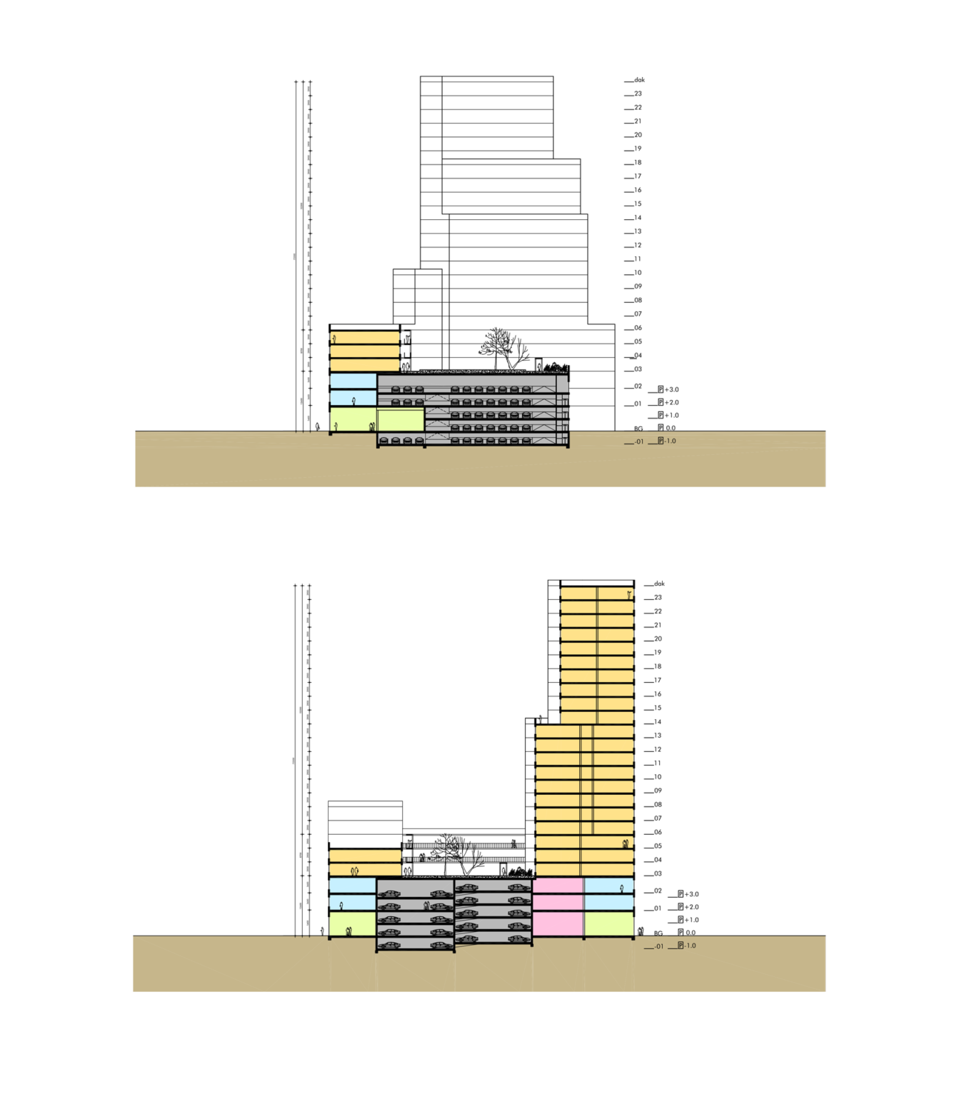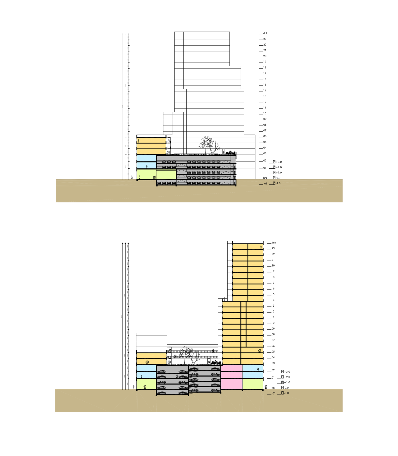 Middenin het blok bevindt zich een zeer efficiënte garage. De constructie hiervan staat los van de toren.