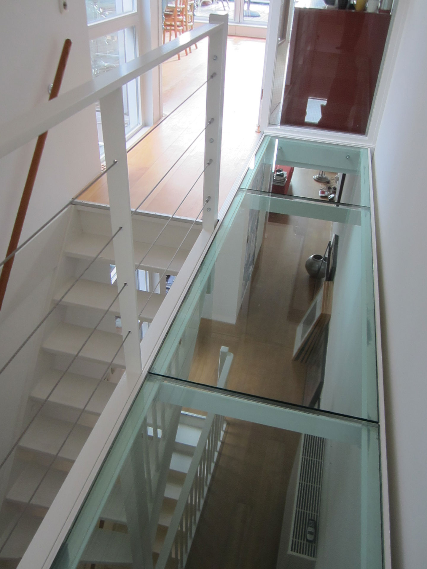 De opbouwen zijn in eenzelfde materiaal gebouwd als de bestaande huizen. Het trappenhuis tussen het voorhuis en het achterhuis is verhoogd, met een nieuwe trap en een glazen brug. Door het glas van de brug valt het licht diep in het trappenhuis.