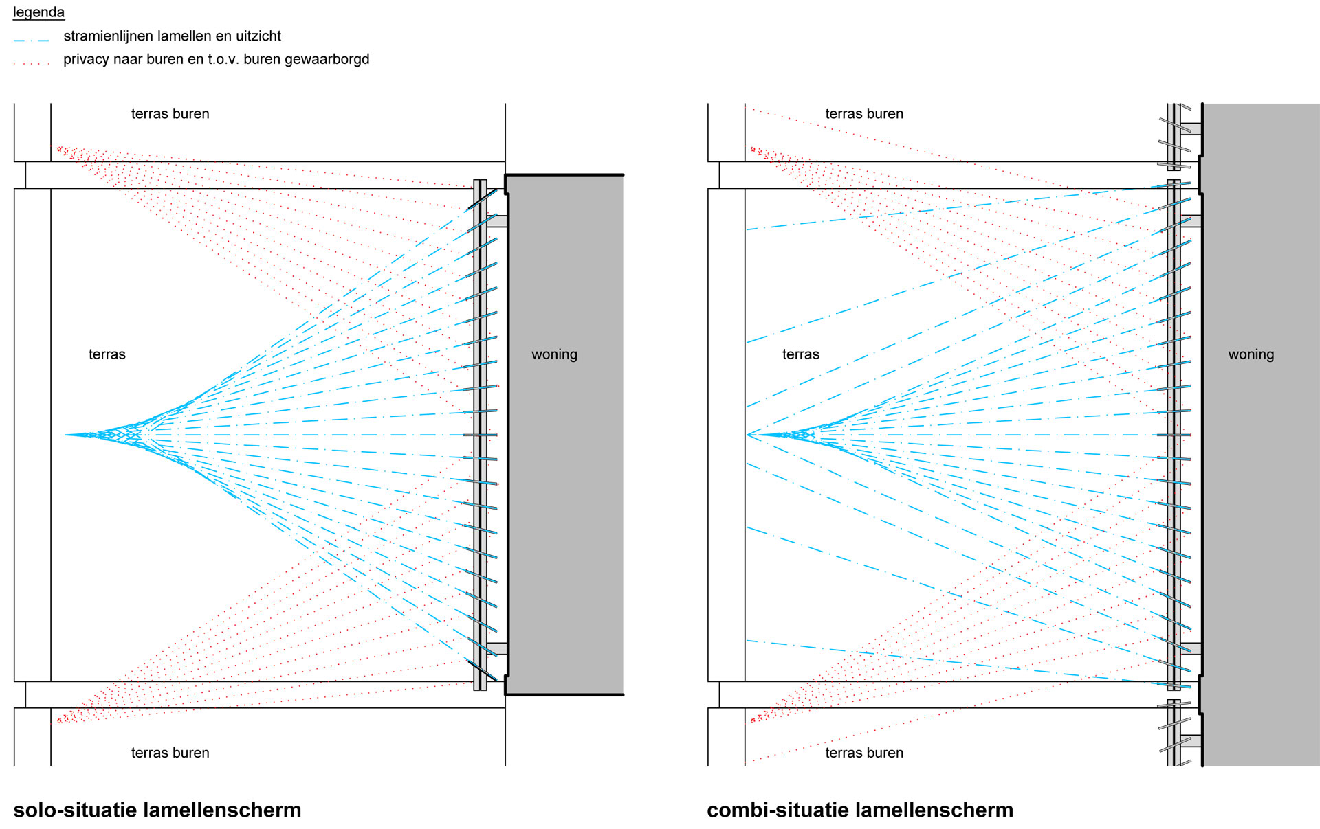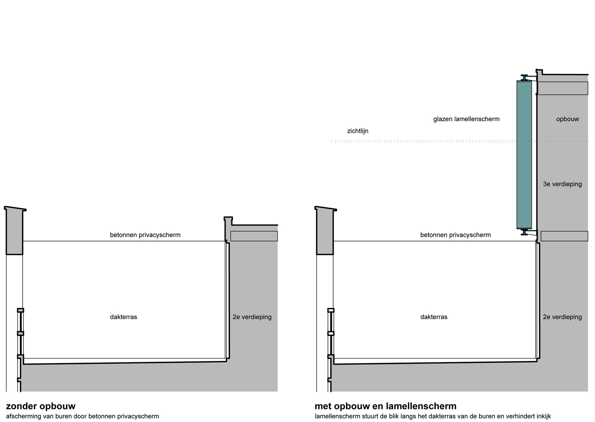 De serie dakopbouwen aan de Borneokade bestaan uit een extra bouwlaag aan de de voorzijde en aan de achterzijde. De opbouw voor heeft als gevel een lamellenscherm. Het scherm van staal en glas geeft het dakvolume een abstract karakter en zorgt er voor dat vanuit de opbouw niet op het dakterras van de buren gekeken kan worden en vice versa. De lamellen zijn zo gedraaid dat de privacy van de bewoner én de buren wordt verzekerd. Het scherm is solo toegepast en in combinatie met naastgelegen schermen. Afhankelijk van die positie zijn de laatste lamellen zo ‘gekamd’ dat er een nette overgang ontstaat.