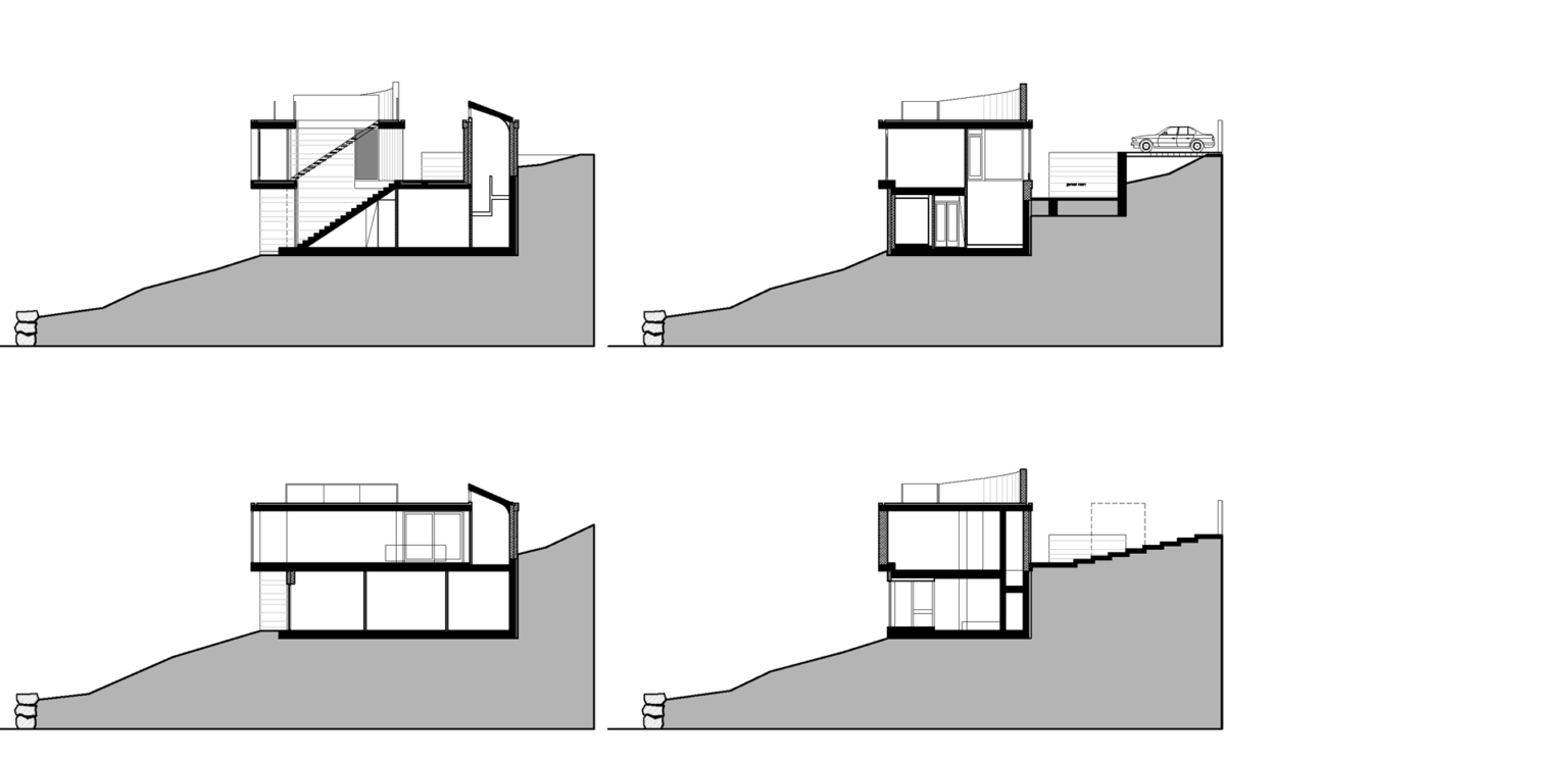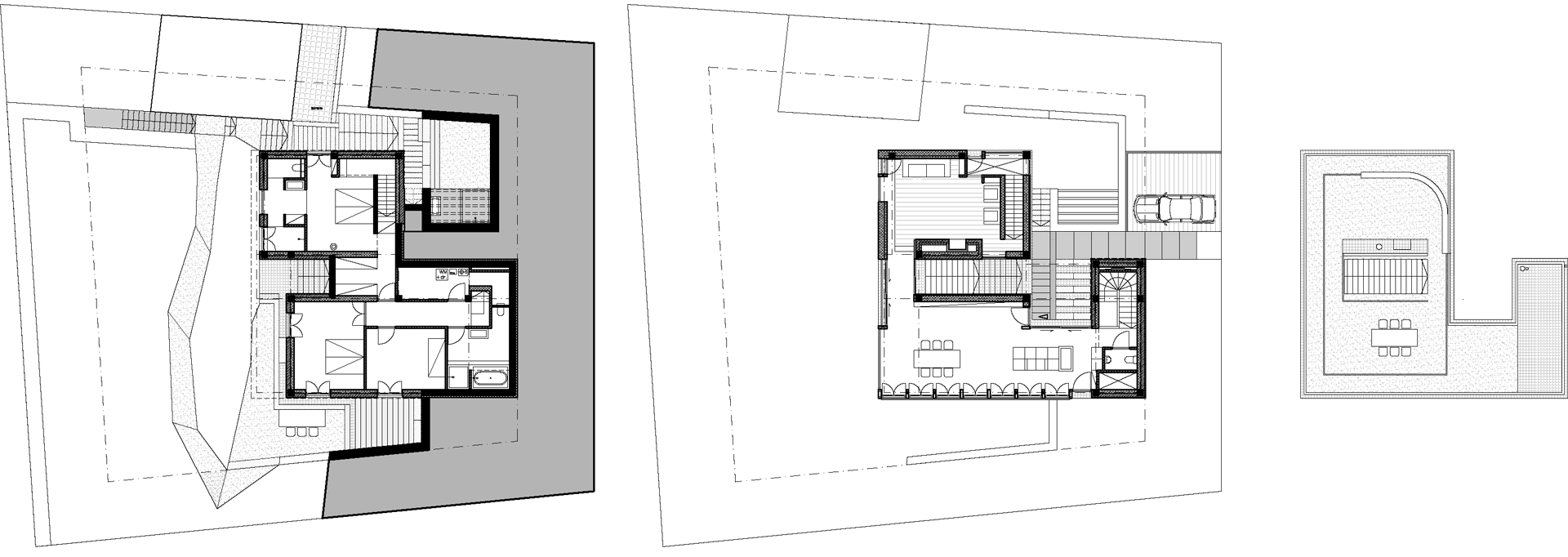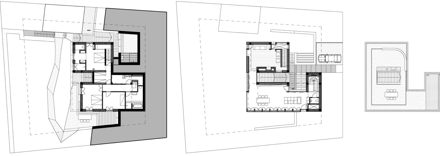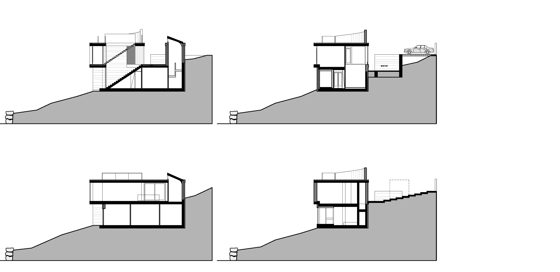De kavel heeft een hoogteverschil van 10 meter. De entree is bovenaan de kavel. Een flauwe trap leidt naar de patio met de voordeur. Het huis vouwt zich om de patio heen. Trappen omlaag verbinden de patio met de tuin. Vanuit het huis leidt een buitentrap omhoog tot het dakterras.