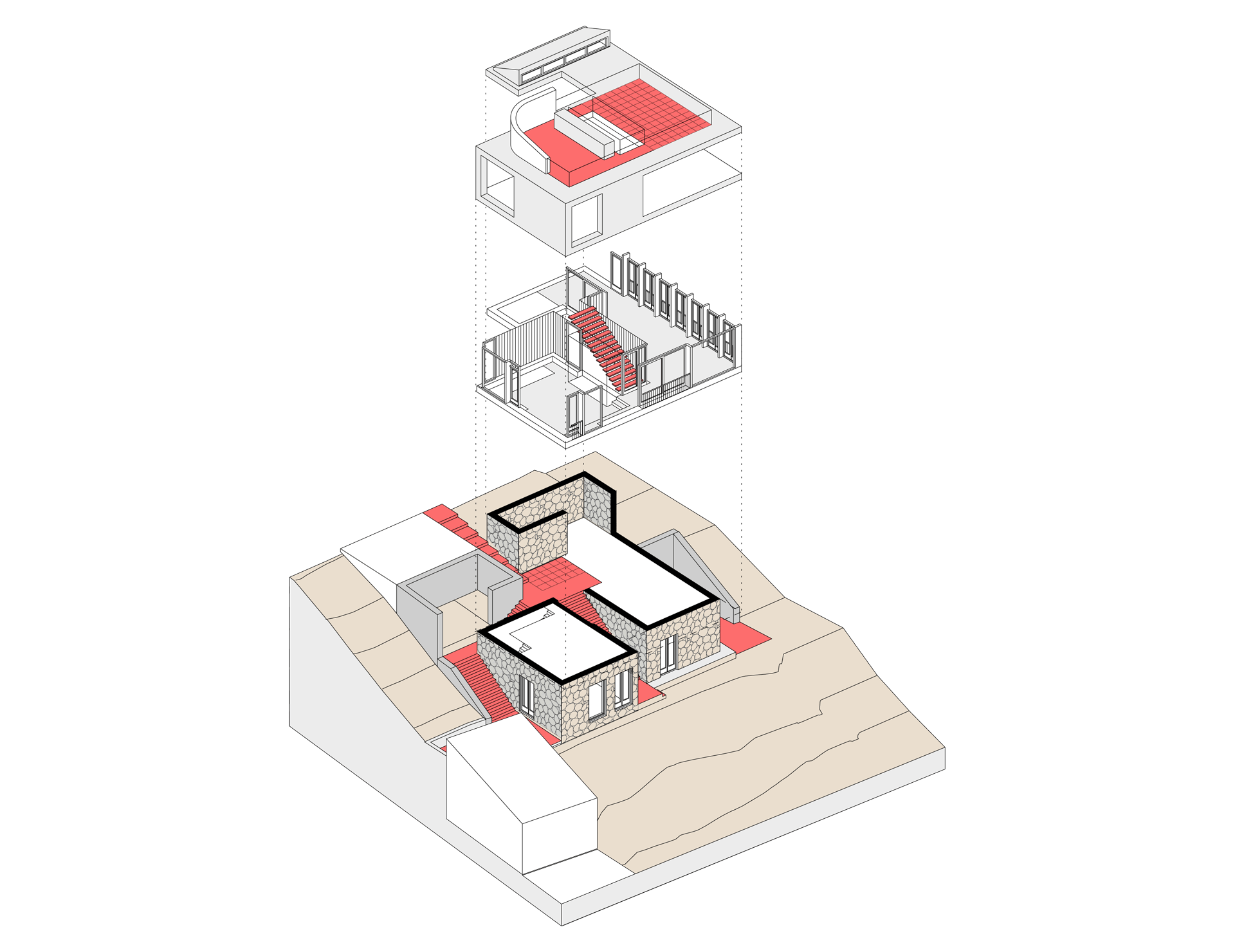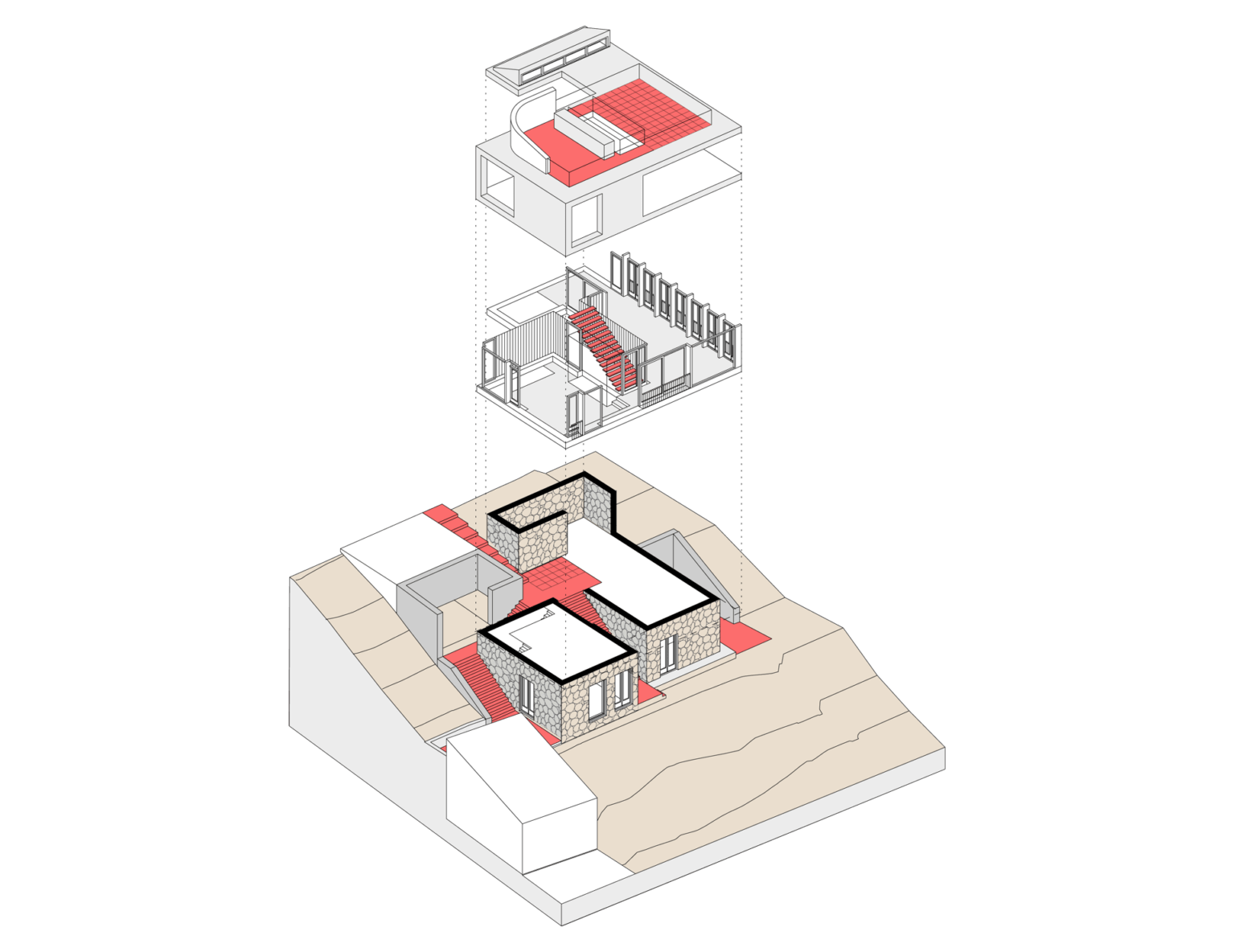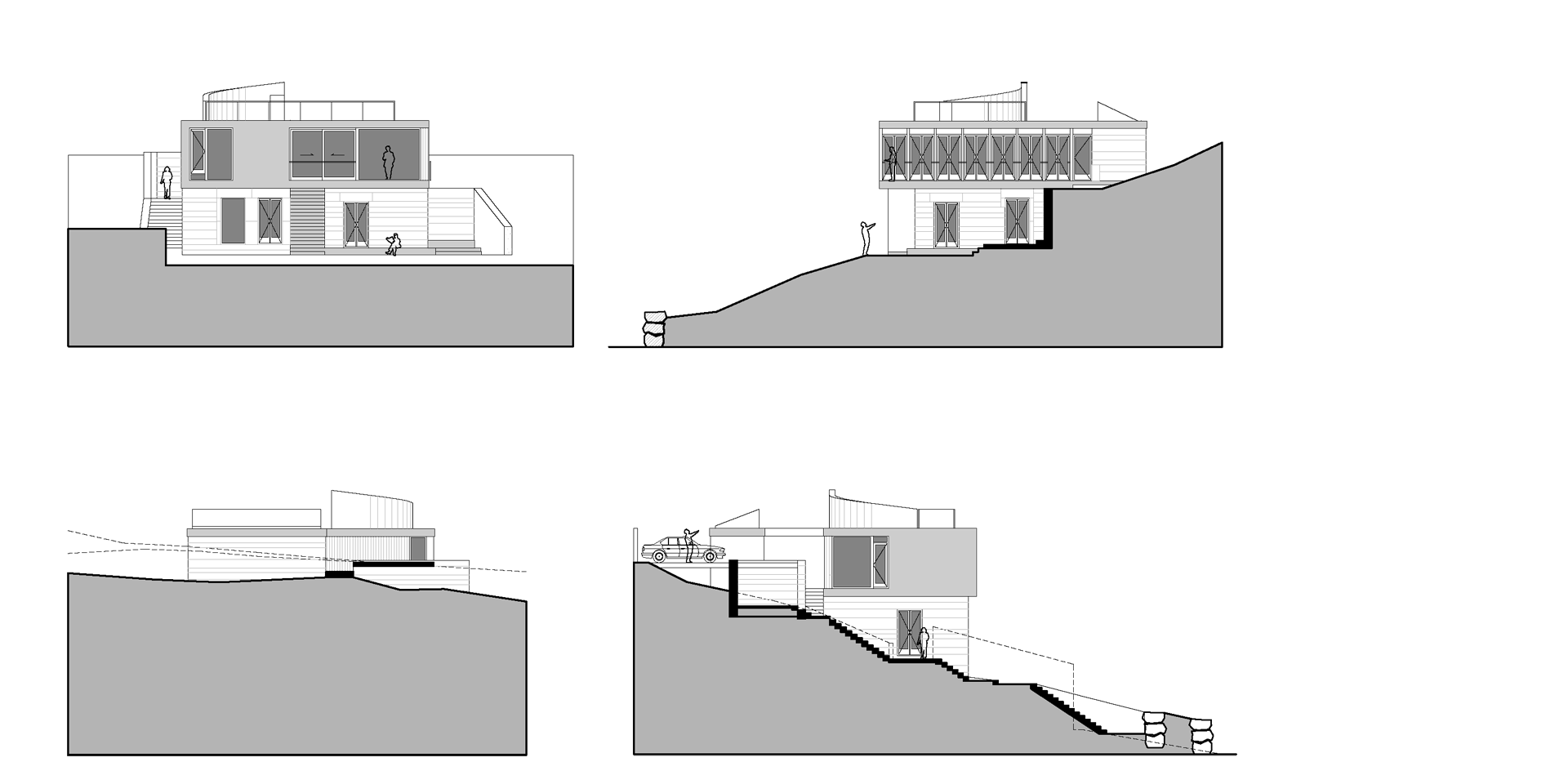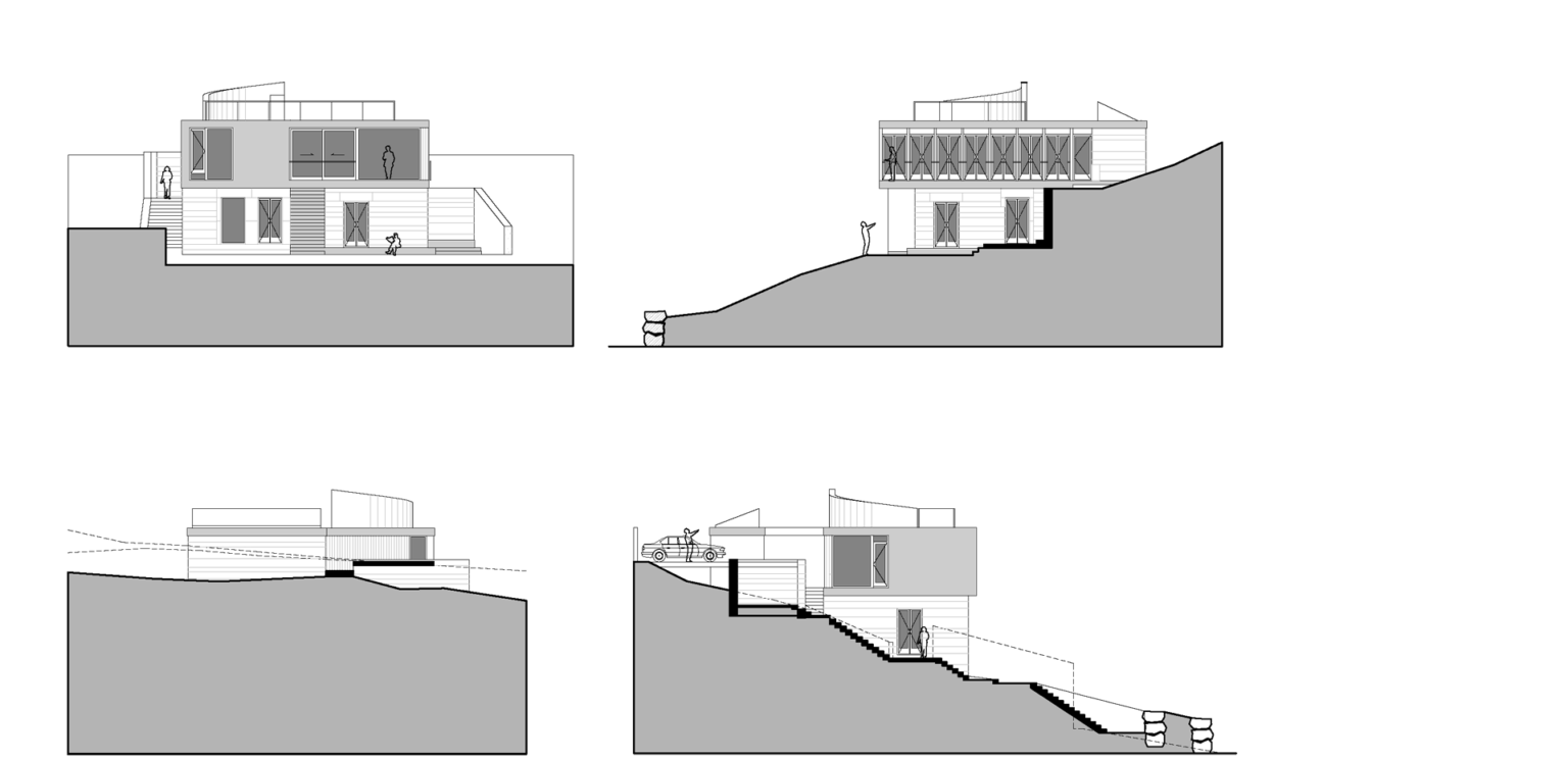 De kavel heeft een hoogteverschil van 10 meter. De entree is bovenaan de kavel. Een flauwe trap leidt naar de patio met de voordeur. Het huis vouwt zich om de patio heen. Trappen omlaag verbinden de patio met de tuin. Vanuit het huis leidt een buitentrap omhoog tot het dakterras.