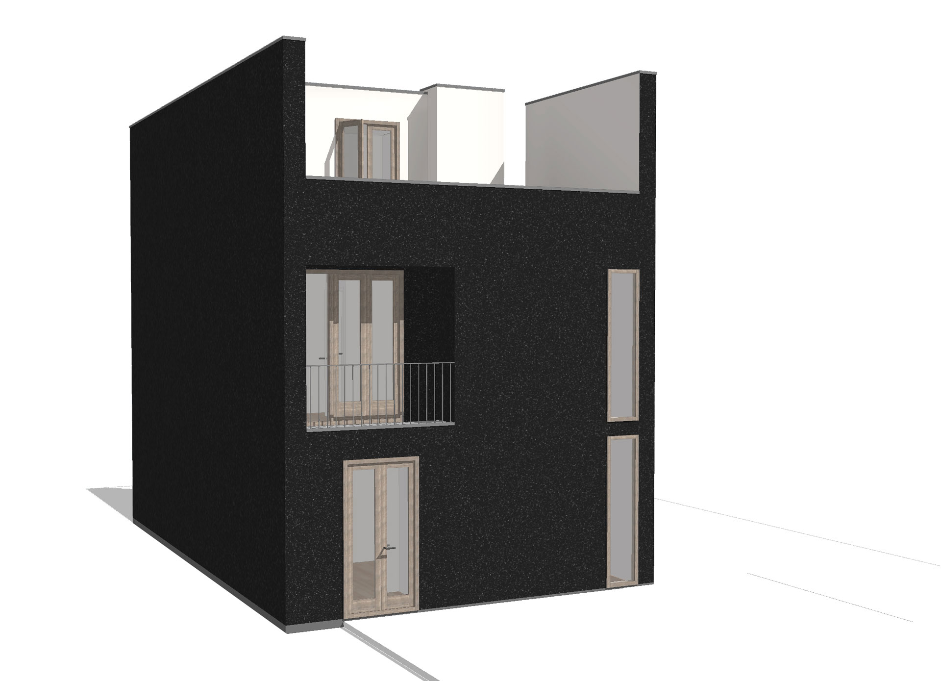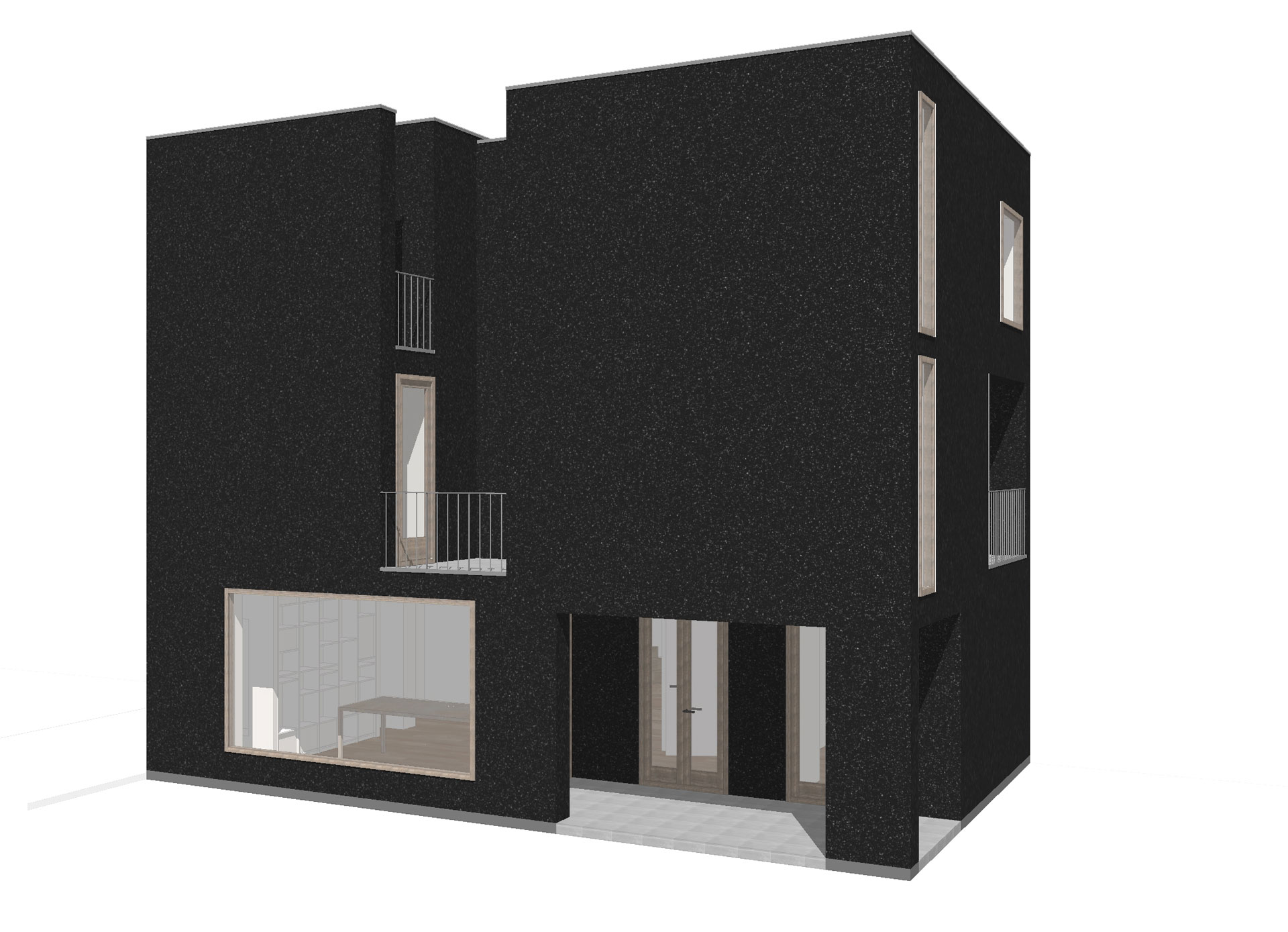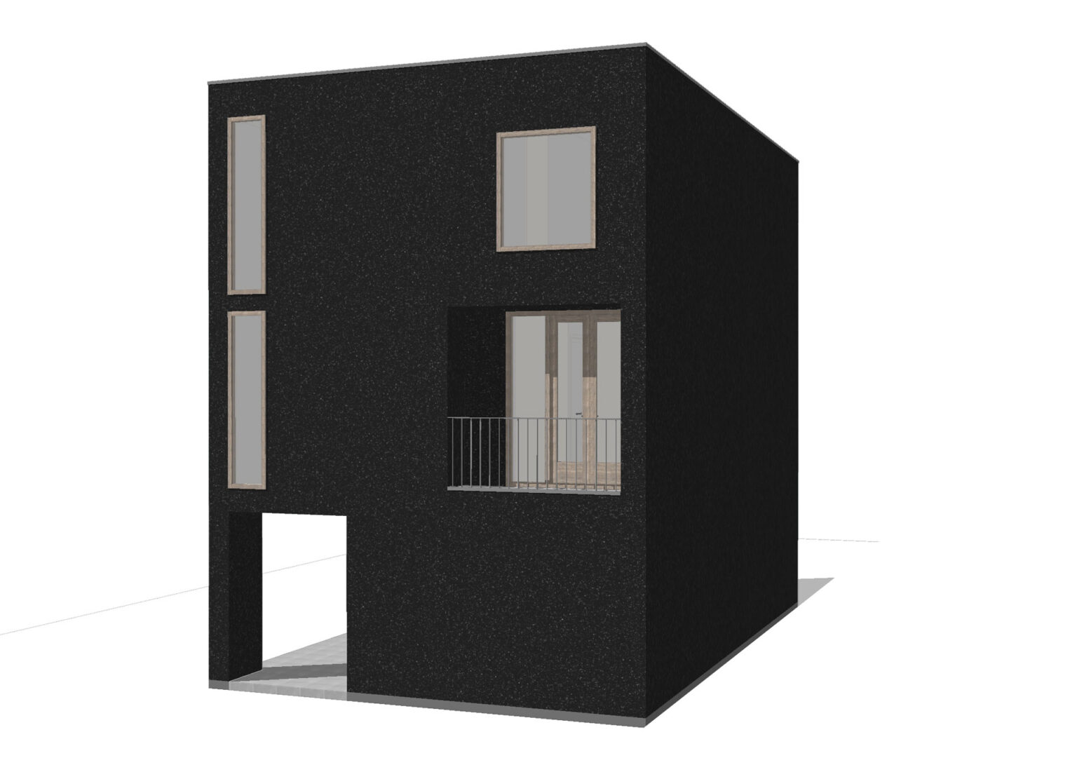 Het huis heeft een constructie van gasbeton, een goedkoop en licht materiaal dat constructief én isolerend werkt. De buitengevel is antraciet gestuct. De kozijnen zijn van onbehandeld hardhout. Het huis is ontworpen met zoveel mogelijk individuele plekken: met een maximaal gebruik in een minimale ruimte.