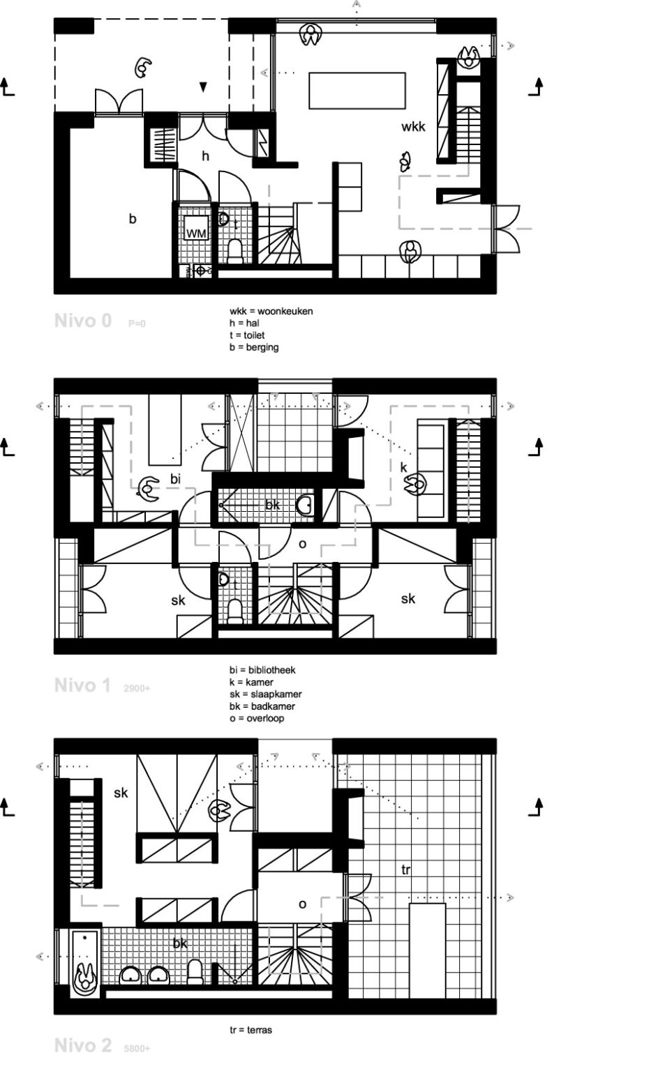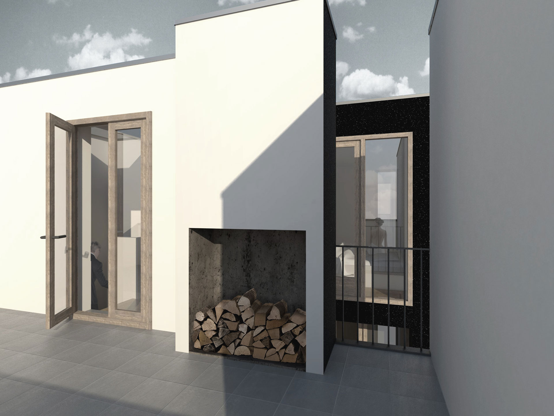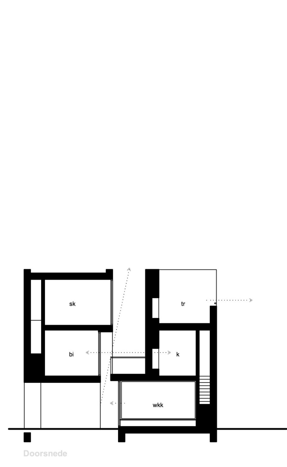 Het dagelijks leven verzamelt zich in de woonkeuken. Het dakterras voorziet in een avondlijk genoegen op een zomeravond bij het haardvuur. De extra trappen en de lichthoven creëren programmatische, ruimtelijke en visuele relaties tussen de verschillende verdiepingen en ruimtes van het huis.