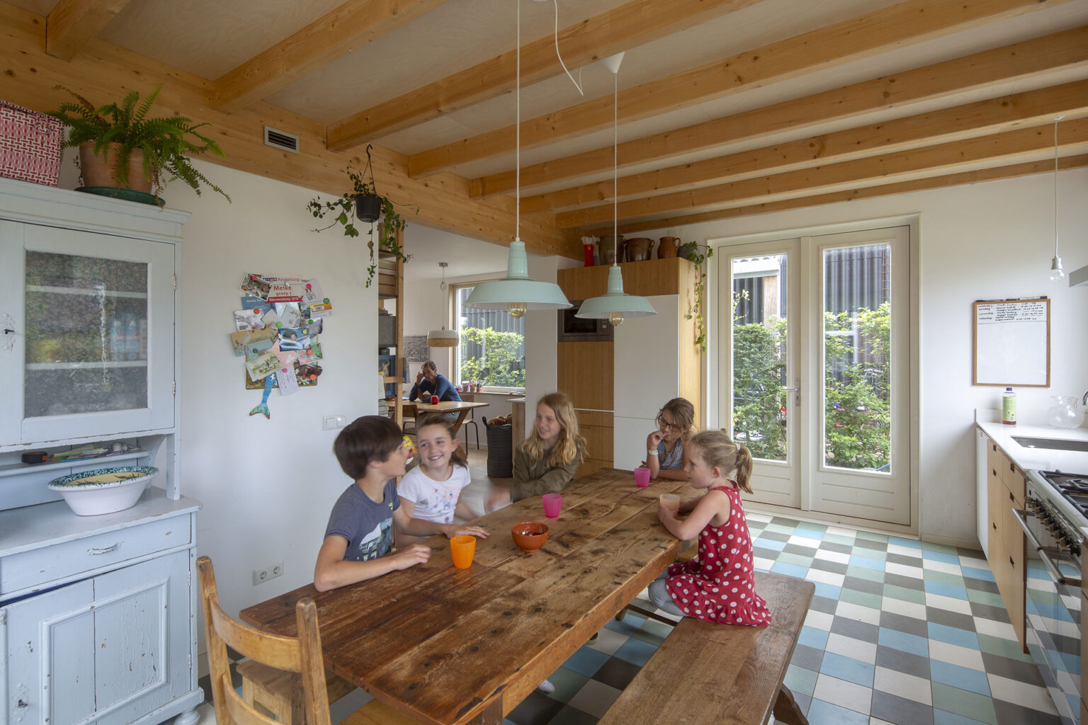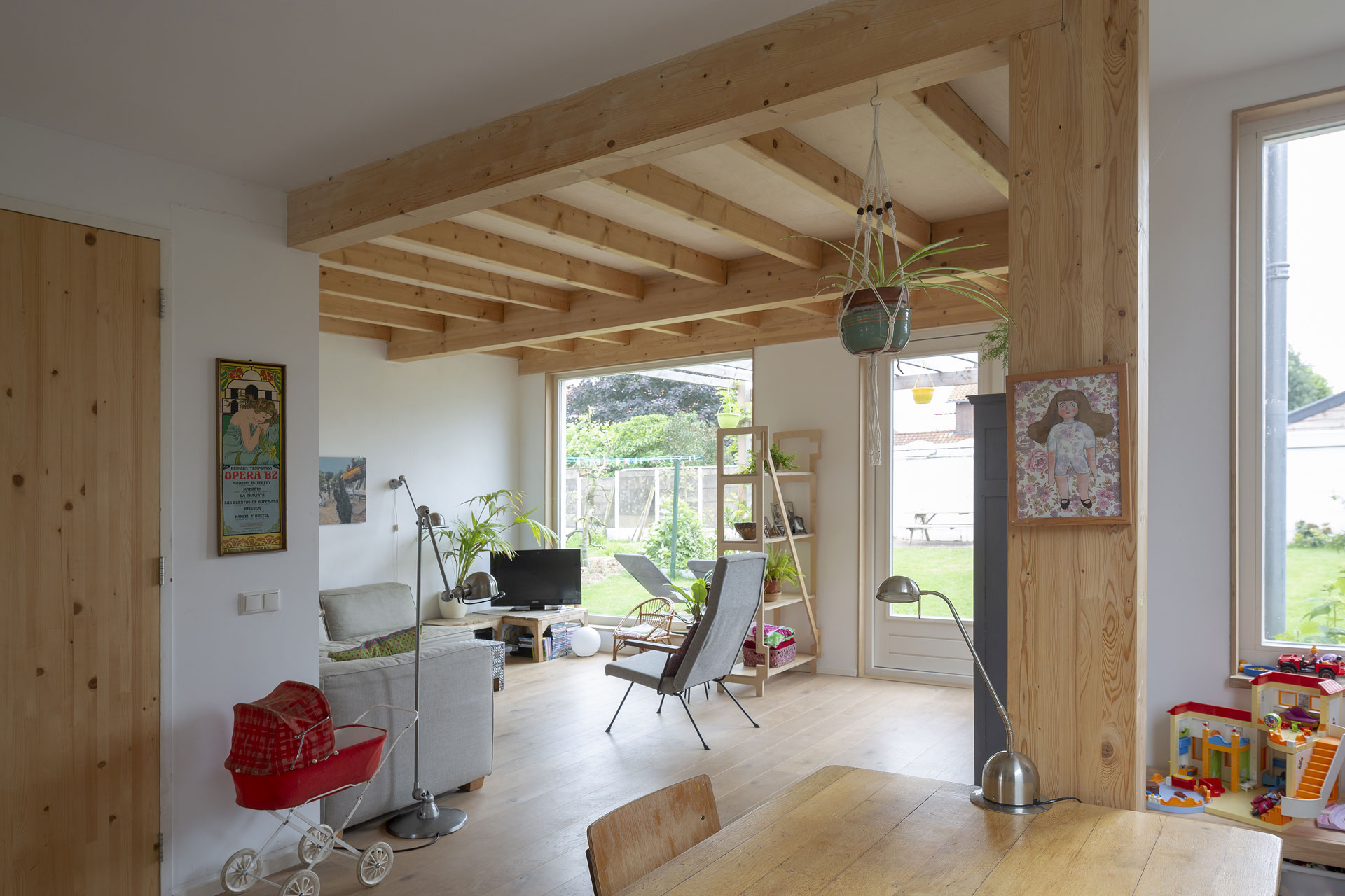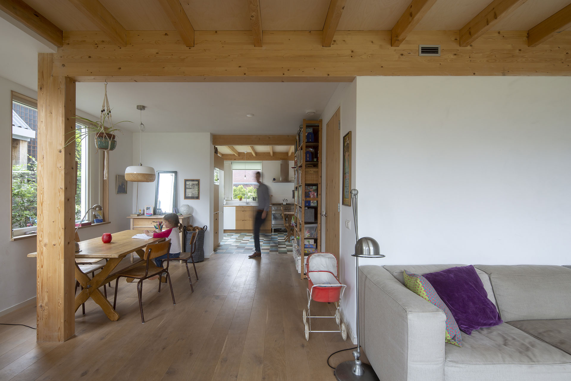 Het huis is gebouwd in houtskeletbouw met houten liggers en met de vloerbalken in zicht.