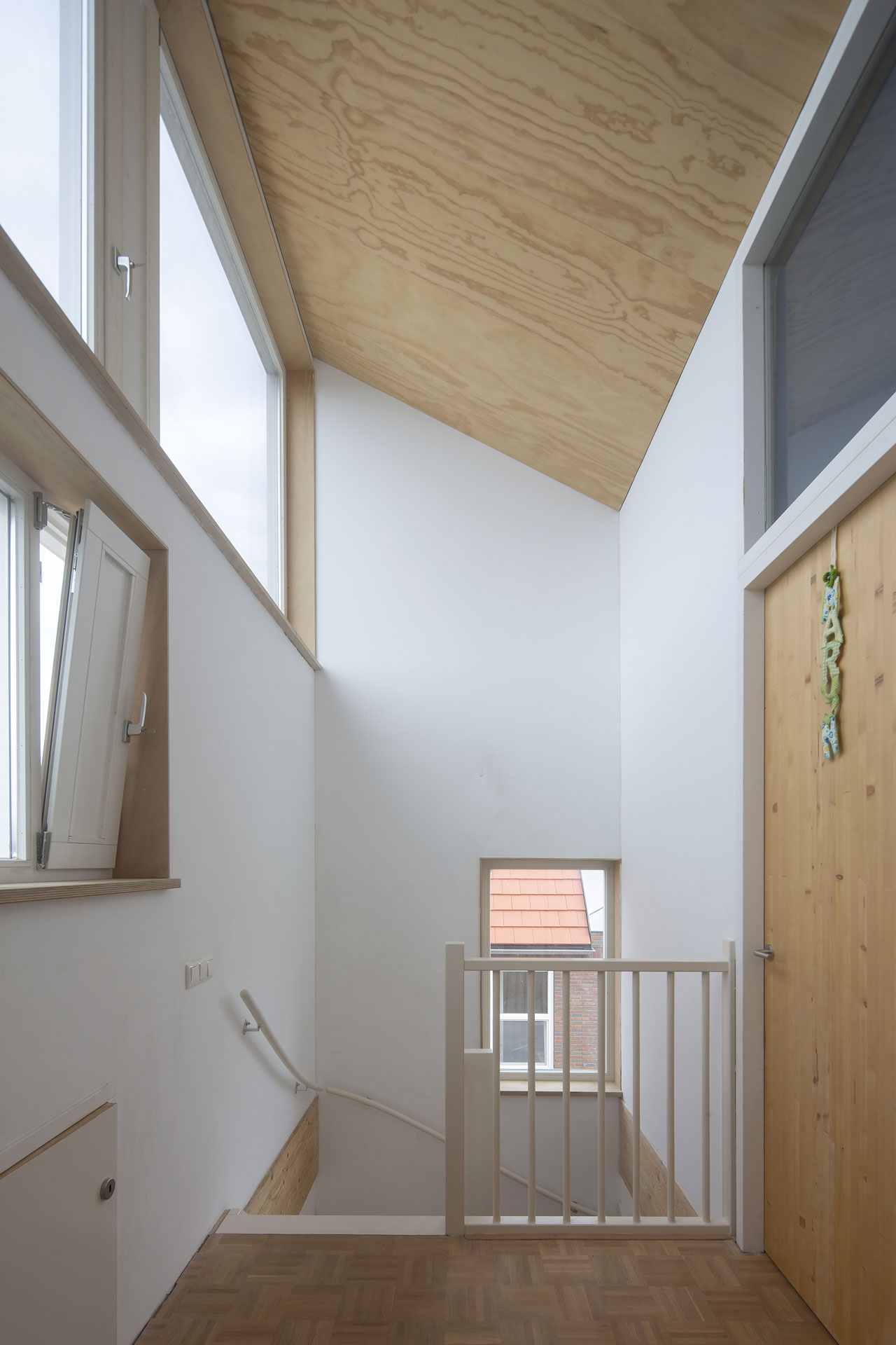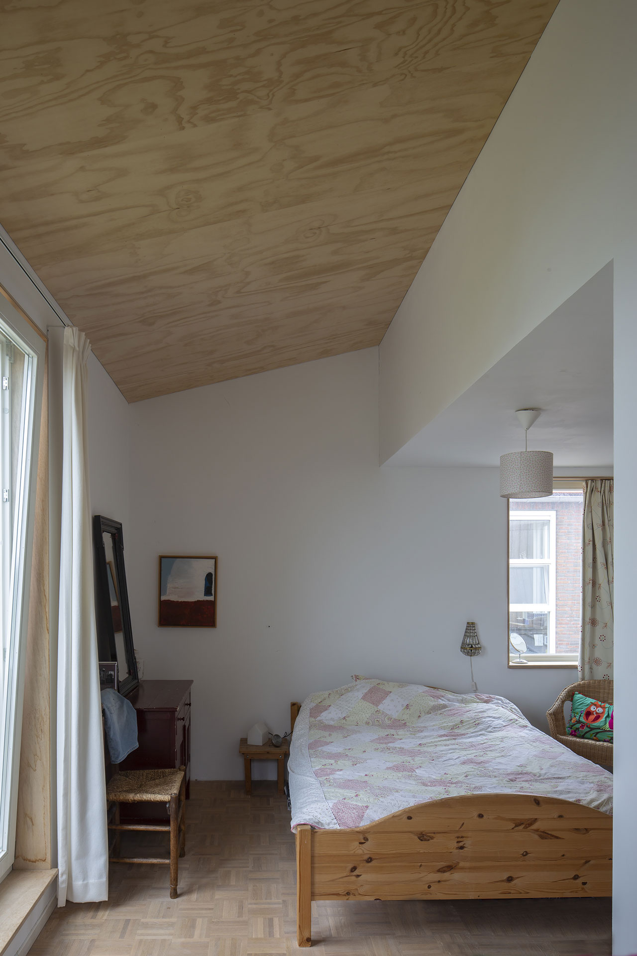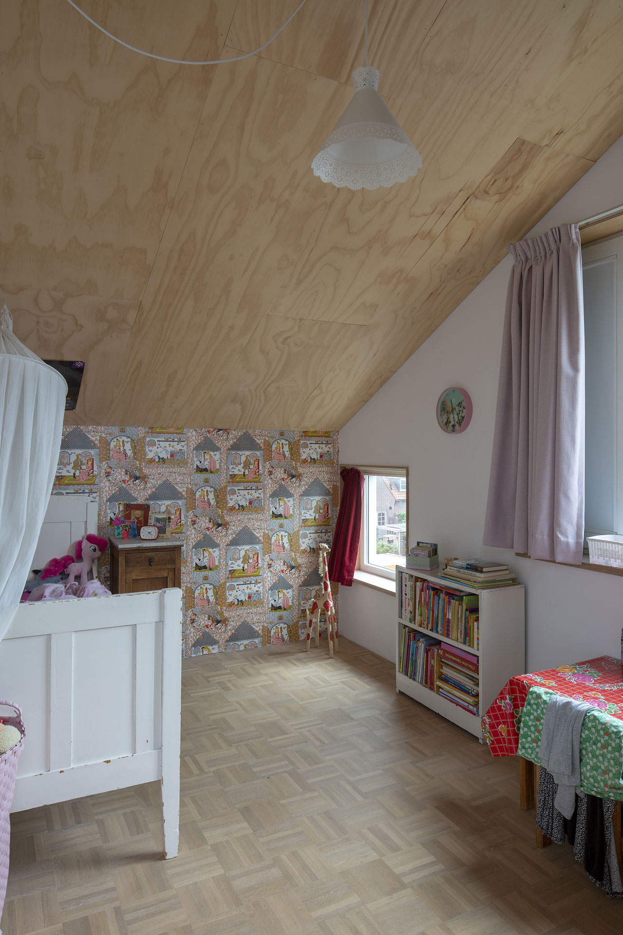 Het huis is gebouwd in houtskeletbouw met houten liggers en met de vloerbalken in zicht.