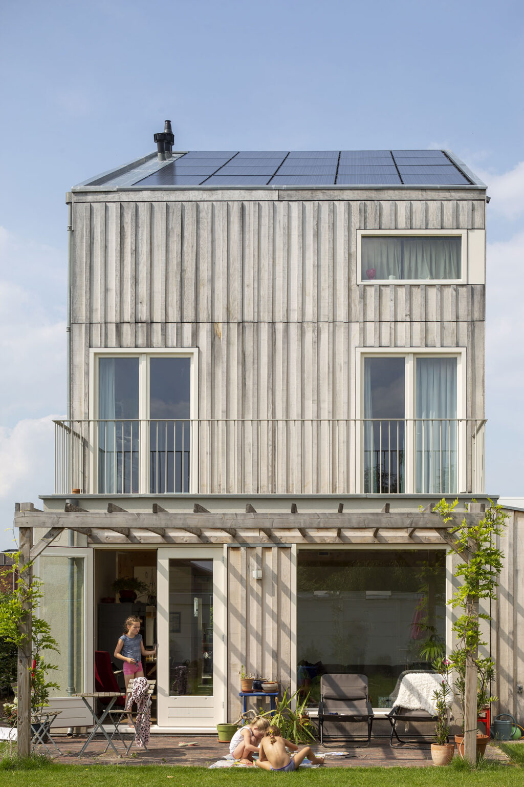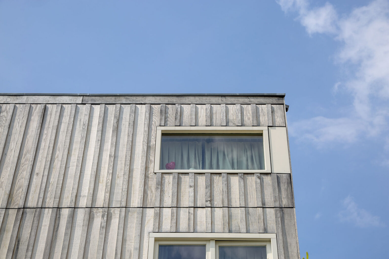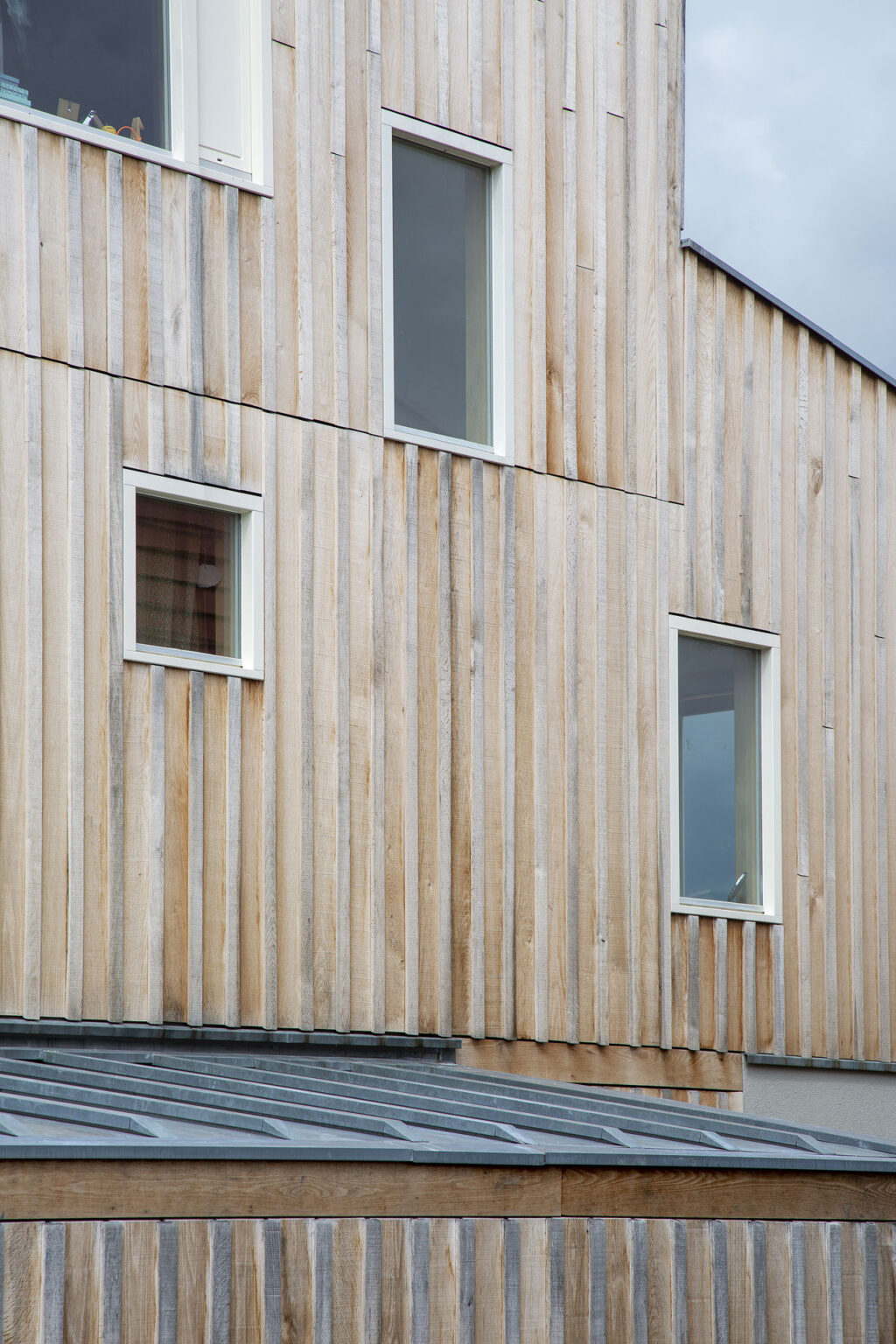 De gevel is bekleed met behandelde eiken planken. Deze zullen in de tijd verder vergrijzen. De dakbedekking is van zink. Met 20 zonnepanelen is het huis qua electriciteit zelfvoorzienend.