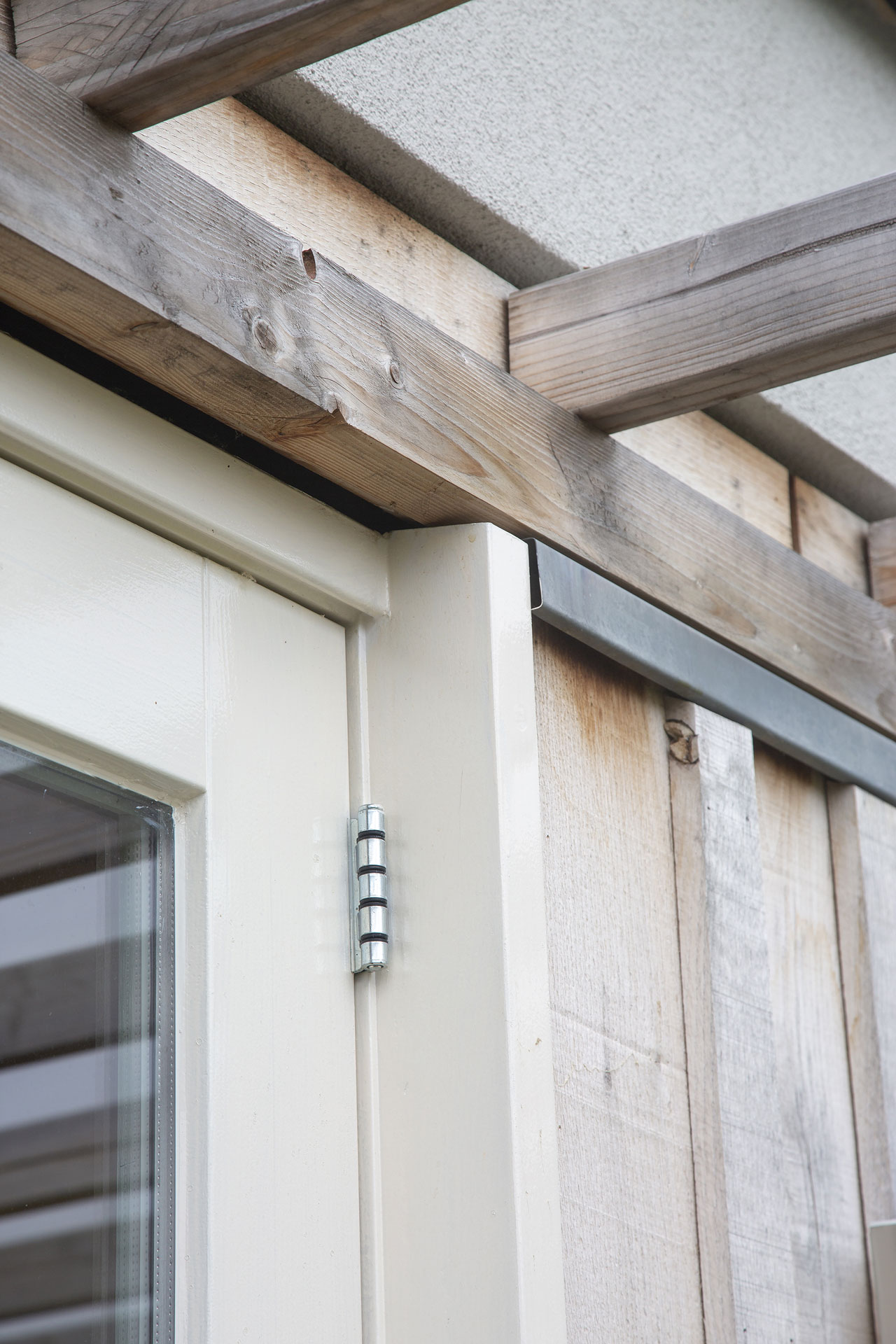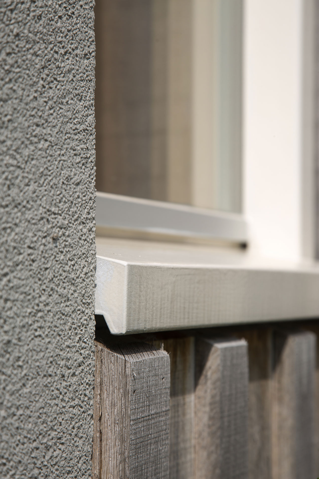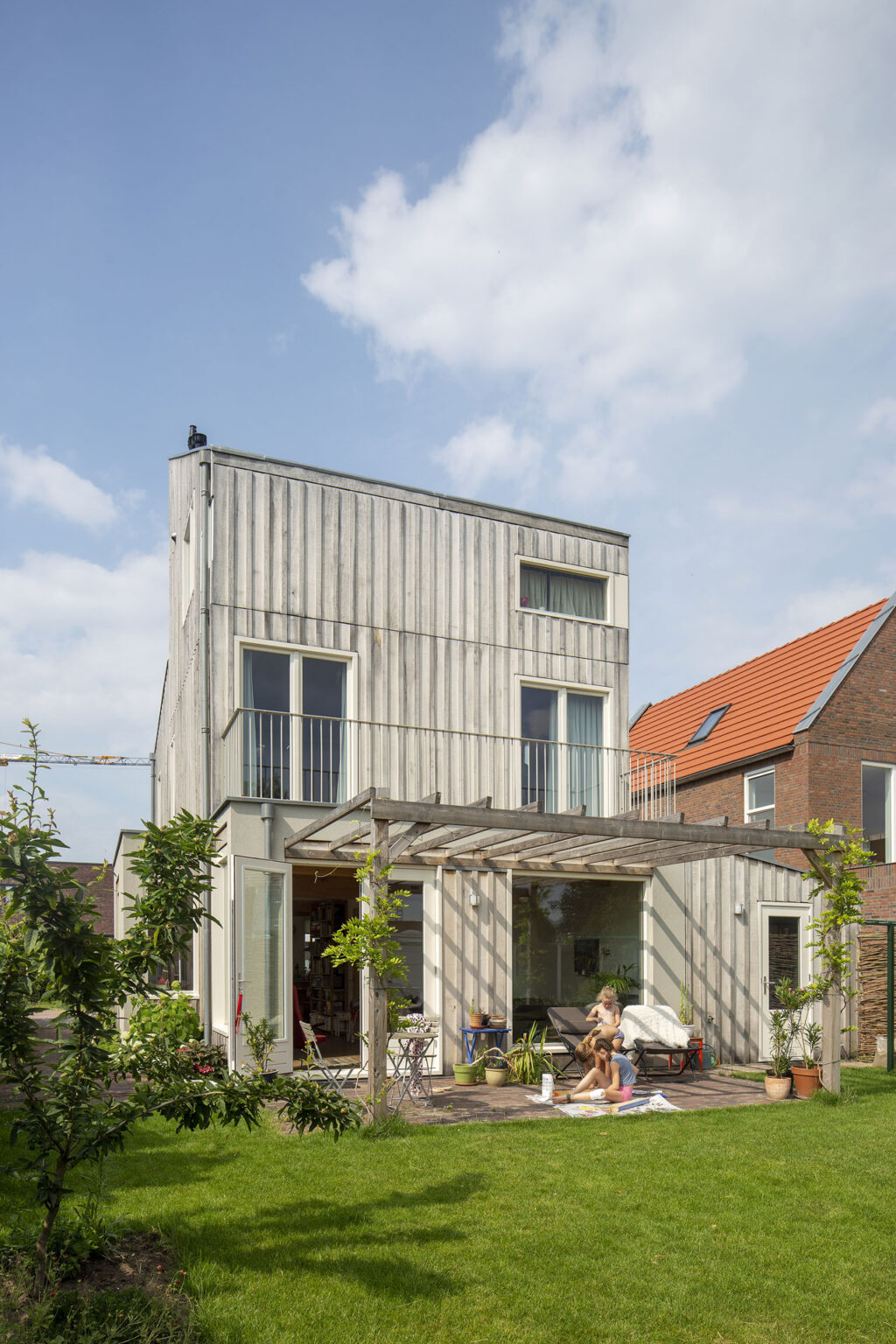 De gevel is bekleed met behandelde eiken planken. Deze zullen in de tijd verder vergrijzen. De dakbedekking is van zink. Met 20 zonnepanelen is het huis qua electriciteit zelfvoorzienend.