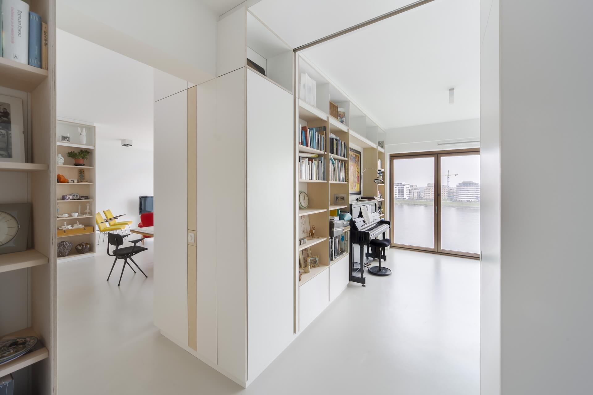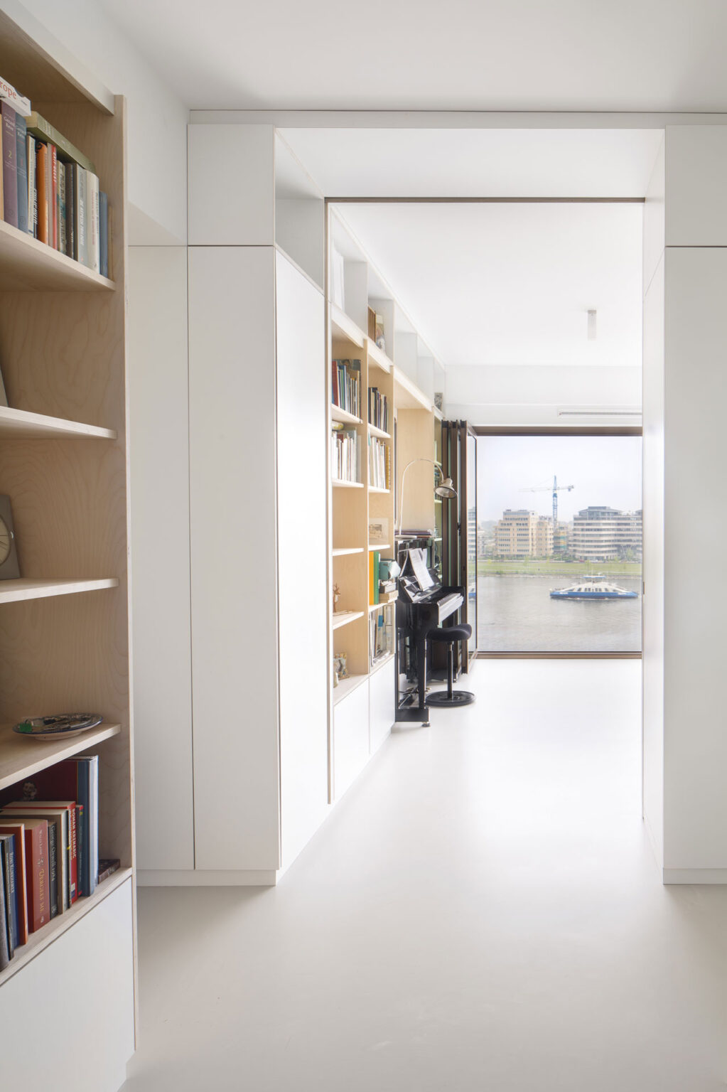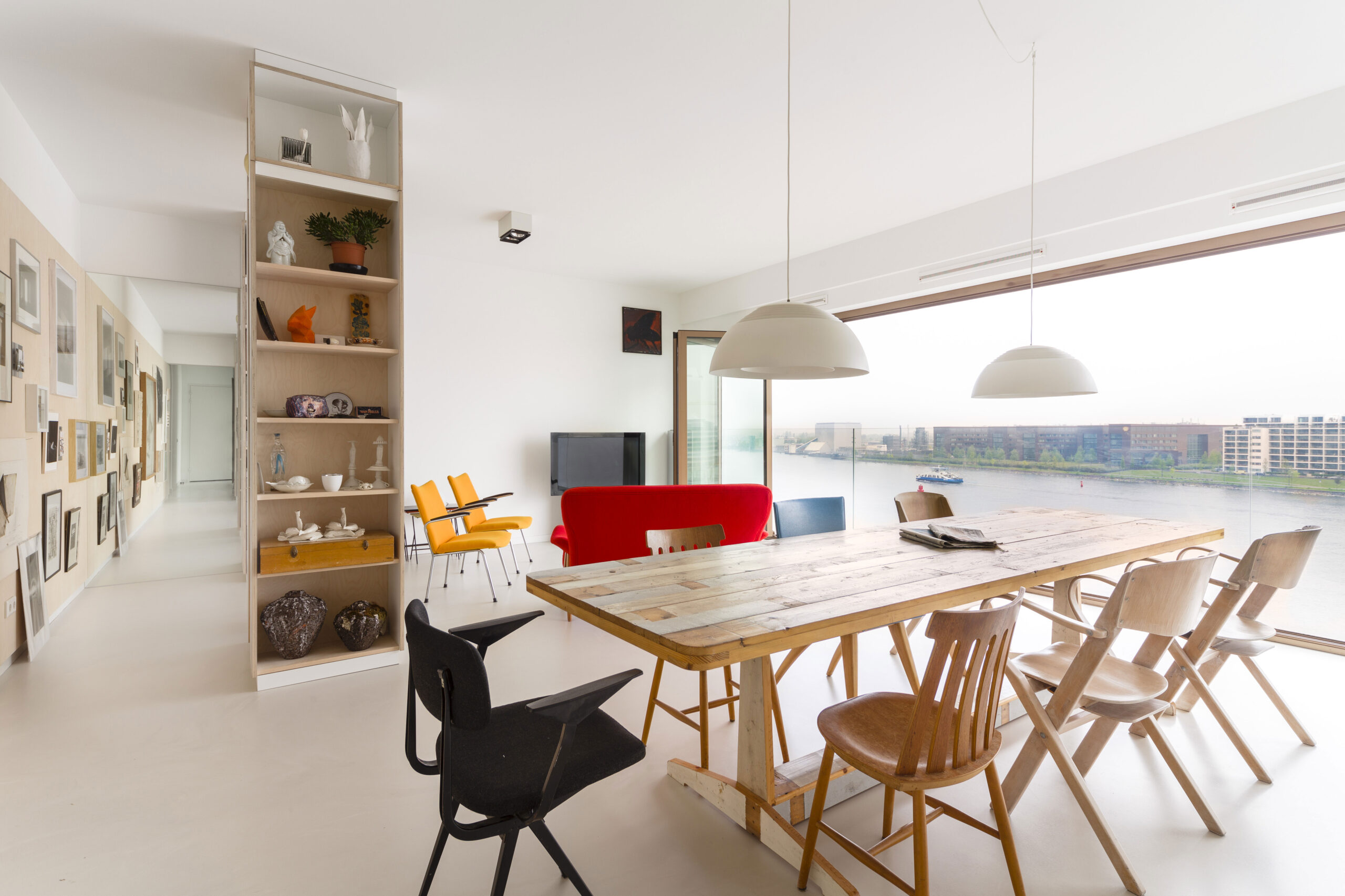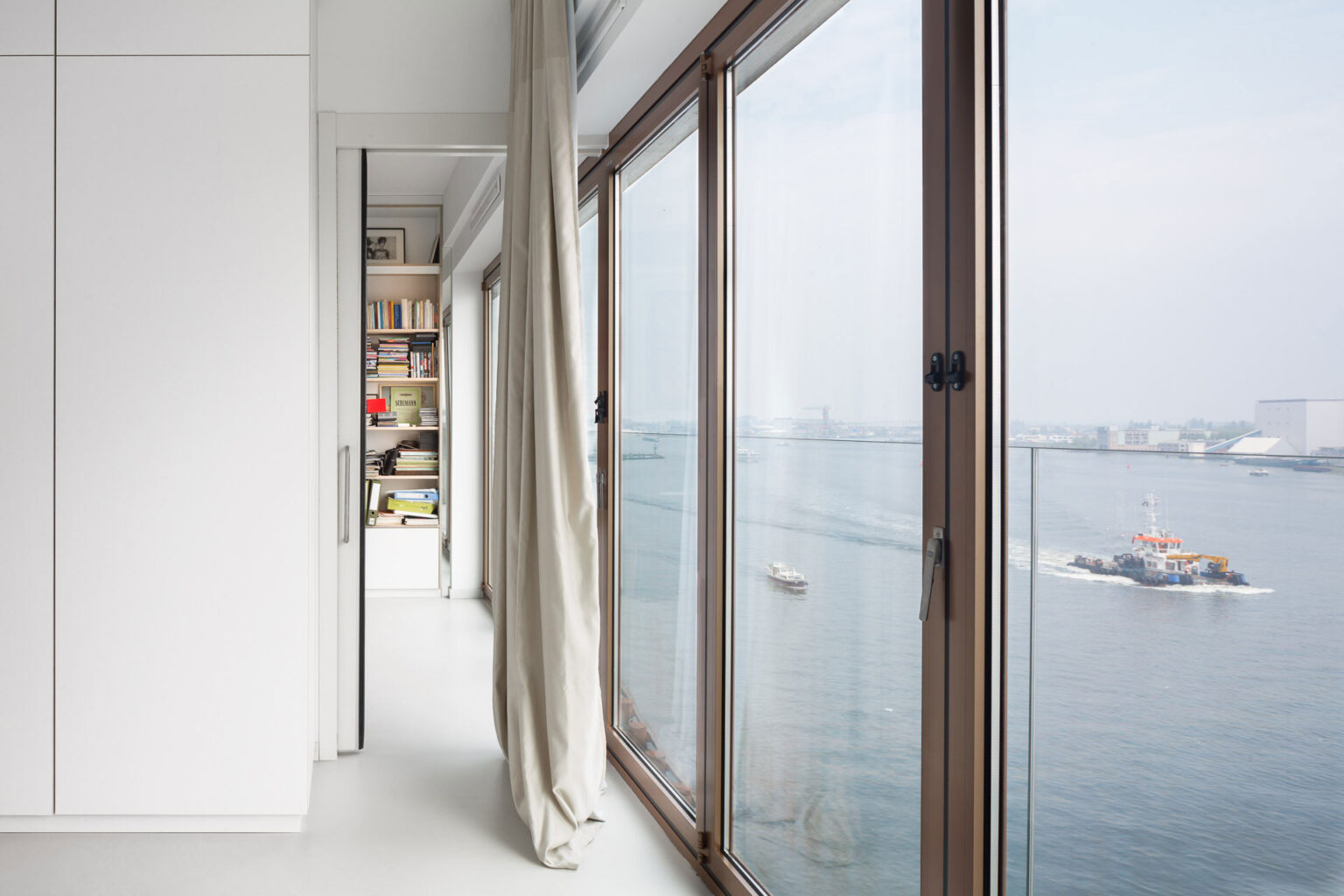 Het ontwerp omvat het gehele vaste interieur. Het interieurontwerp ‘verkleedt’ de enigzins saaie plattegrond en vergroot de ruimtelijkheid van het relatief kleine appartement. Het nieuwe interieur schept plekken binnen ten opzichte van het weidse buiten van het IJ.
