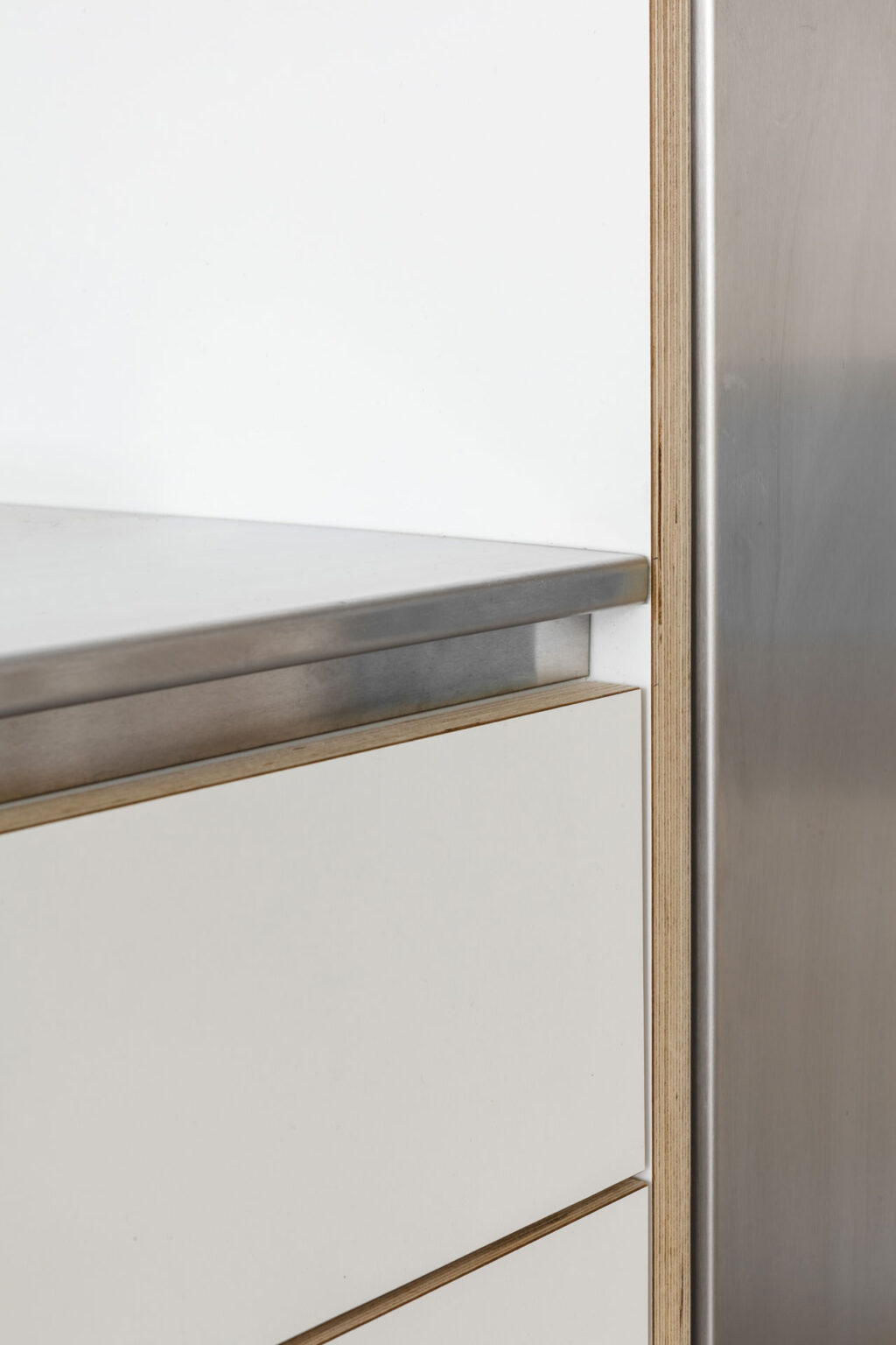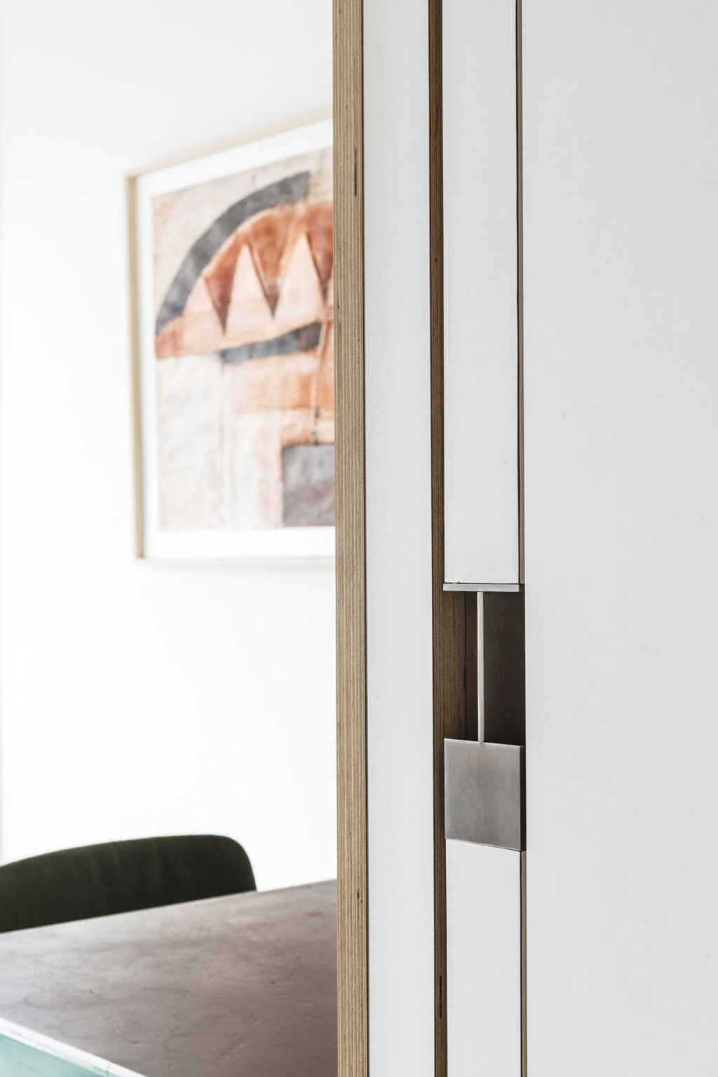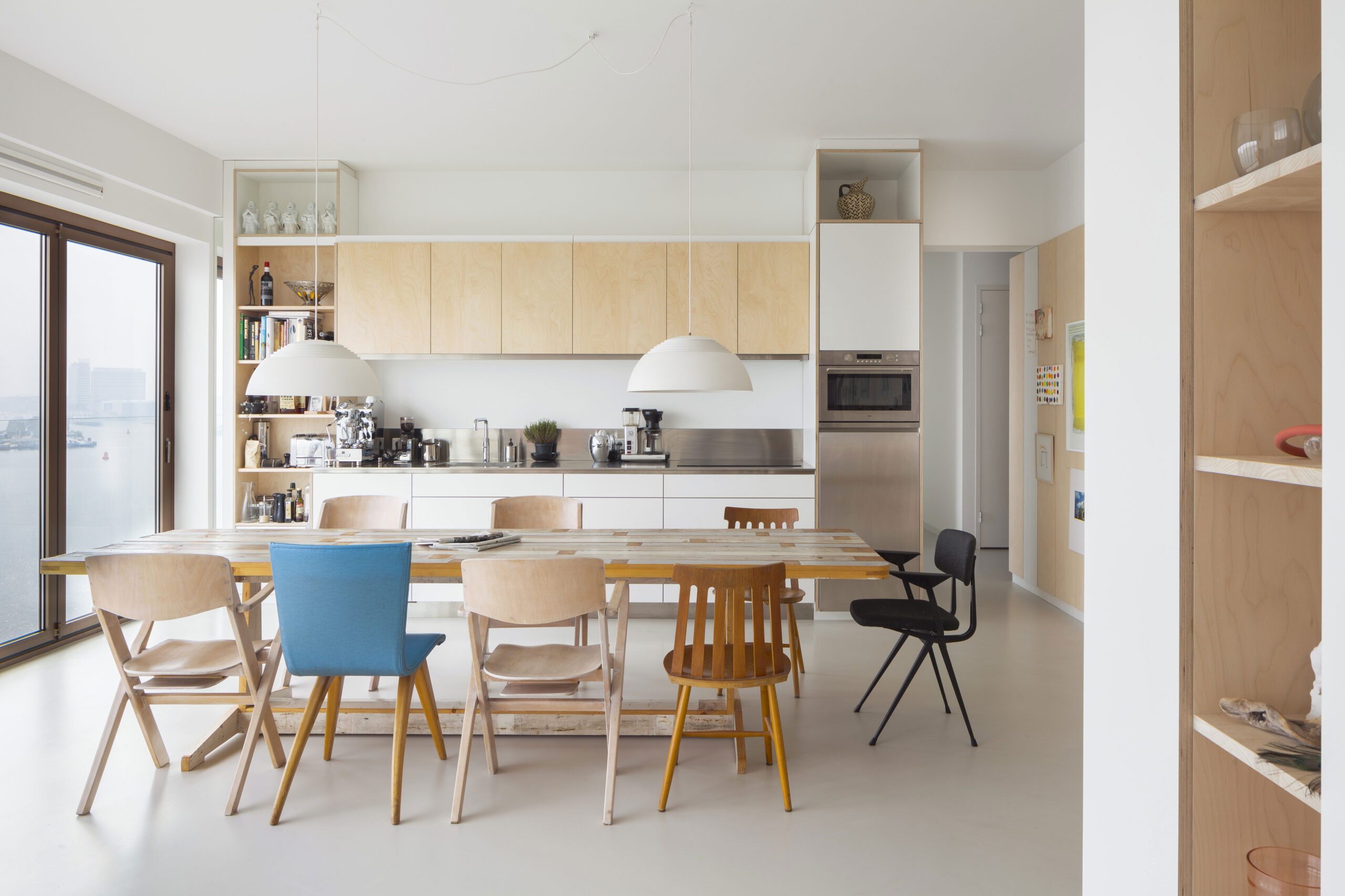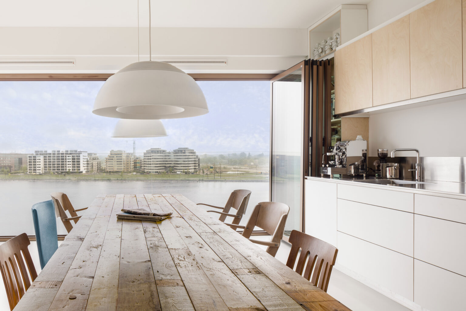 Het ontwerp omvat het gehele vaste interieur. Het interieurontwerp ‘verkleedt’ de enigzins saaie plattegrond en vergroot de ruimtelijkheid van het relatief kleine appartement. Het nieuwe interieur schept plekken binnen ten opzichte van het weidse buiten van het IJ.