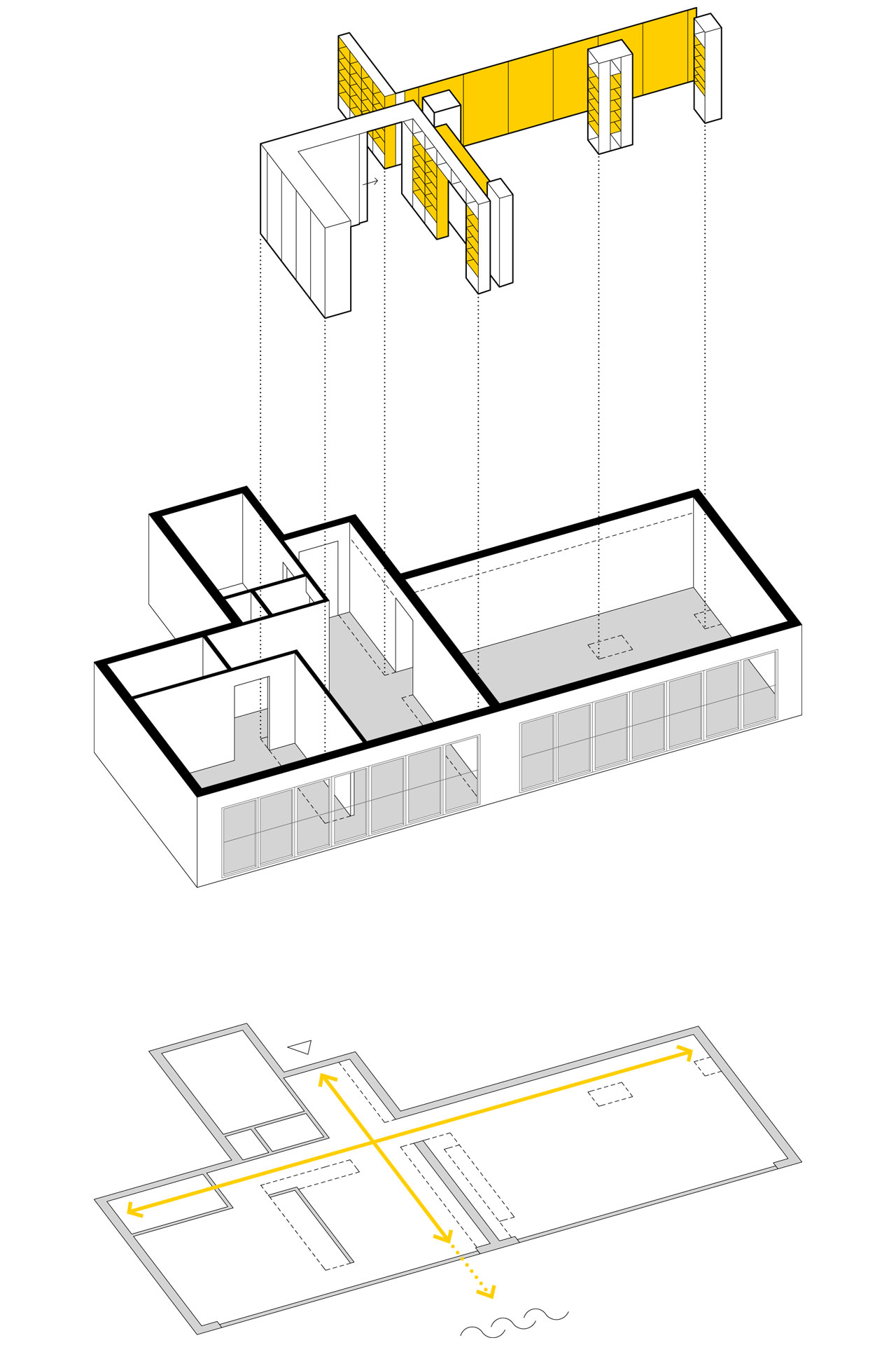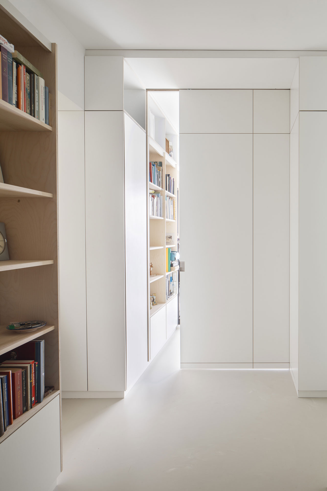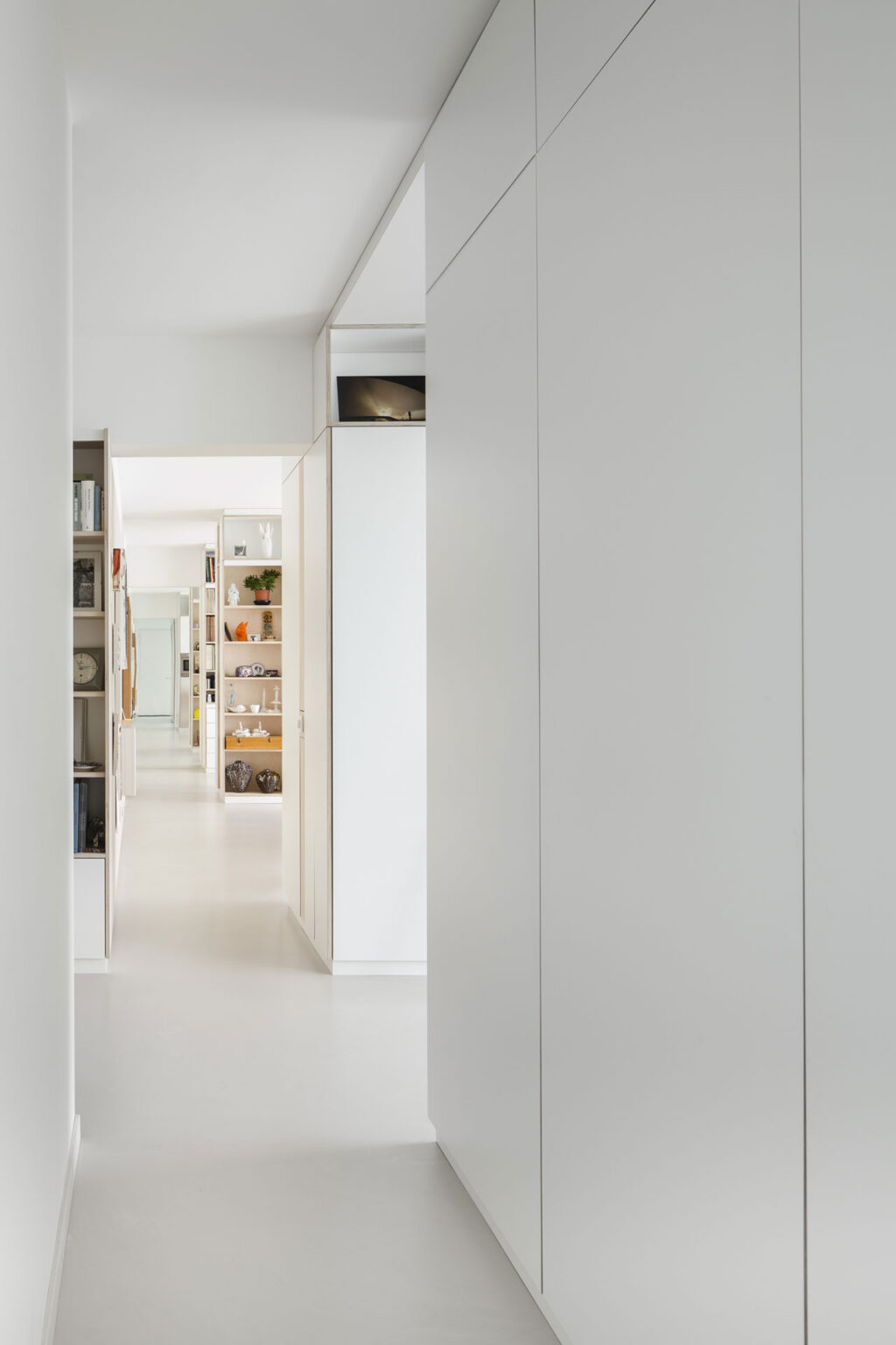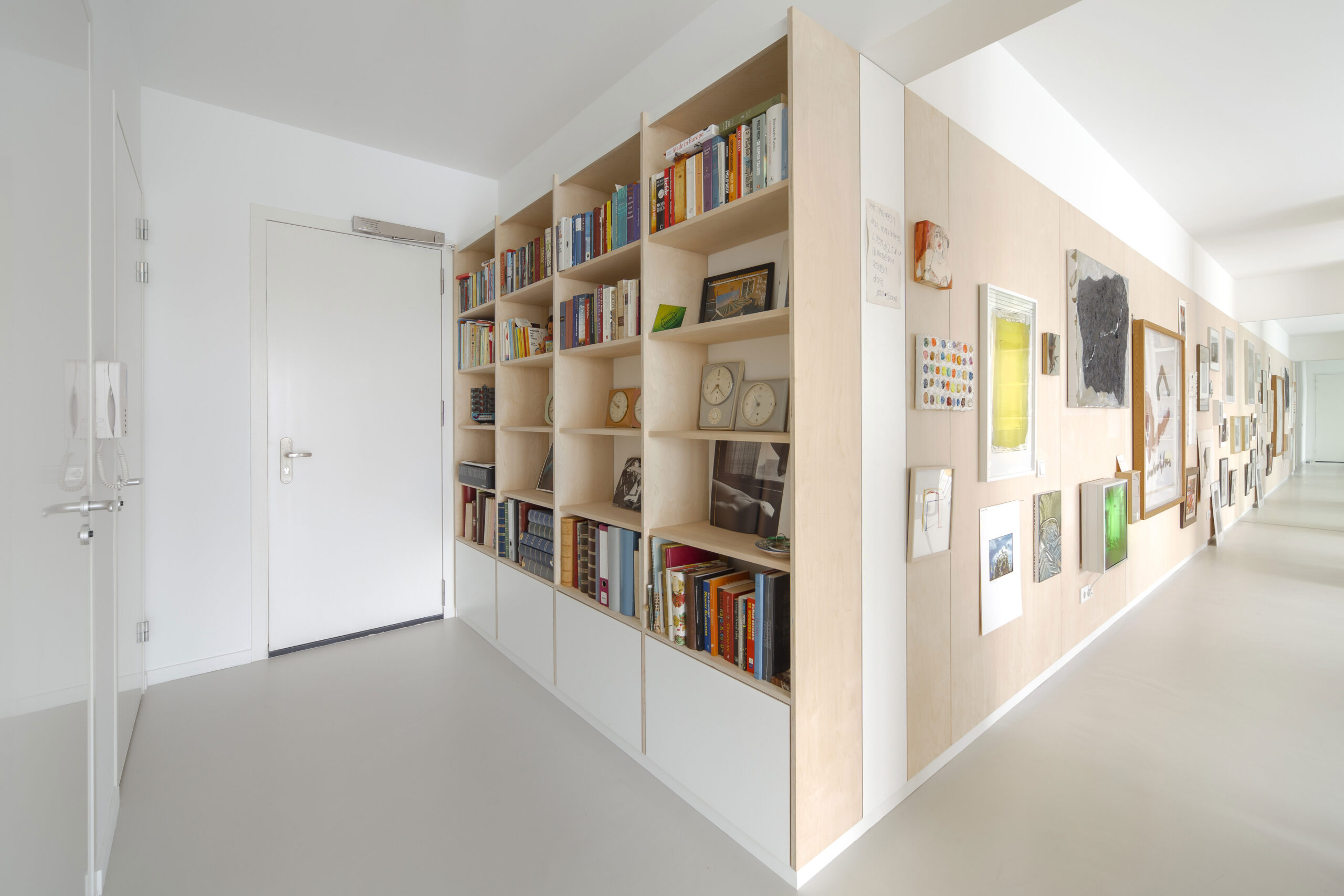 Vanaf de voordeur is zicht op het water. De ‘hall’ is tegelijkertijd garderobe en bibliotheek. Halverwege is het kruispunt met de galerij. Hier is de hall ook afsluitbaar met een schuifdeur om een extra kamer te creëren. De lange galerij ontsluit alle ruimtes. Een spiegel aan het einde verdubbelt de lengte.